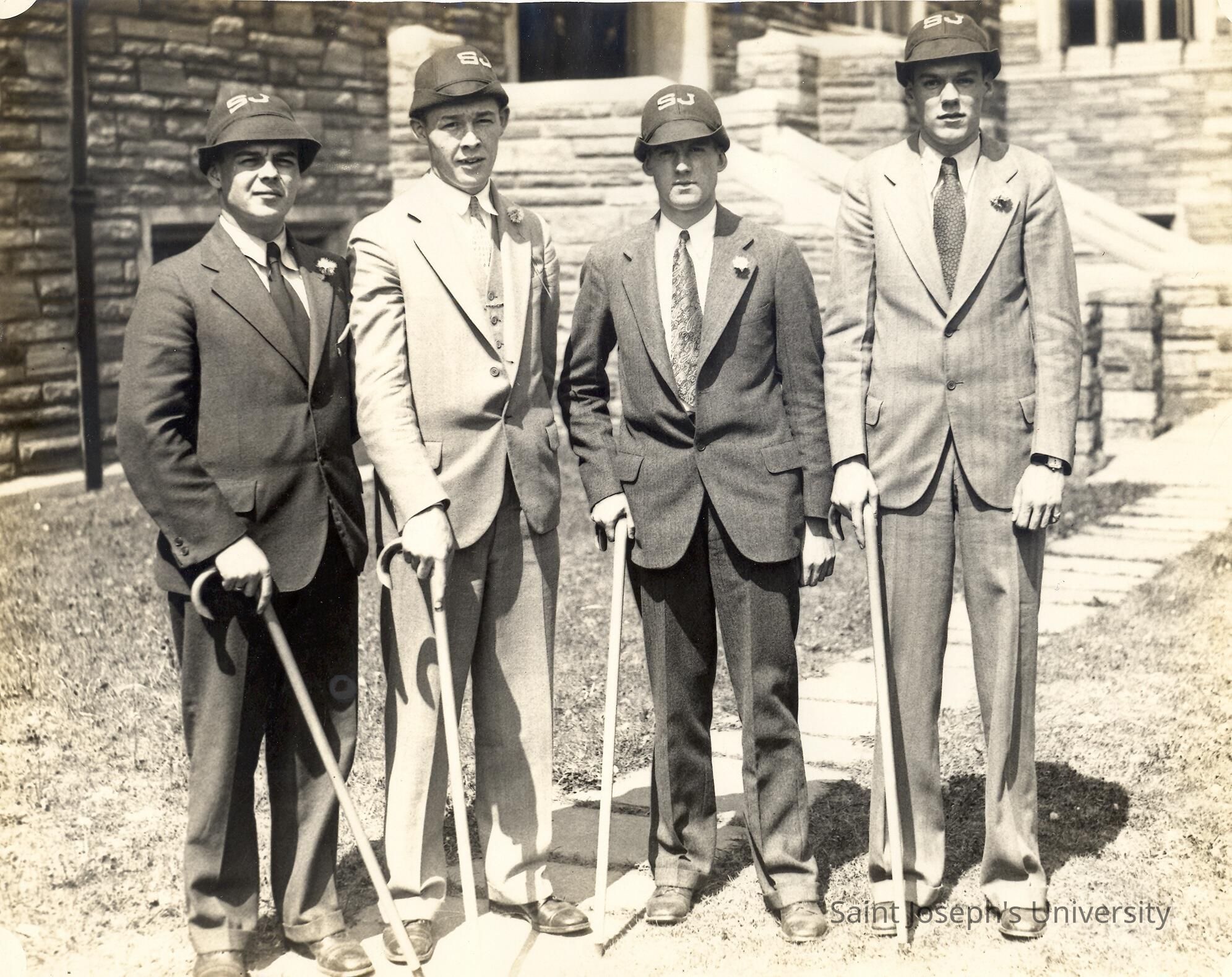 Four students participating in cap and cane walk in Quadrangle. The walk was the opening feature of Junior Week activities.