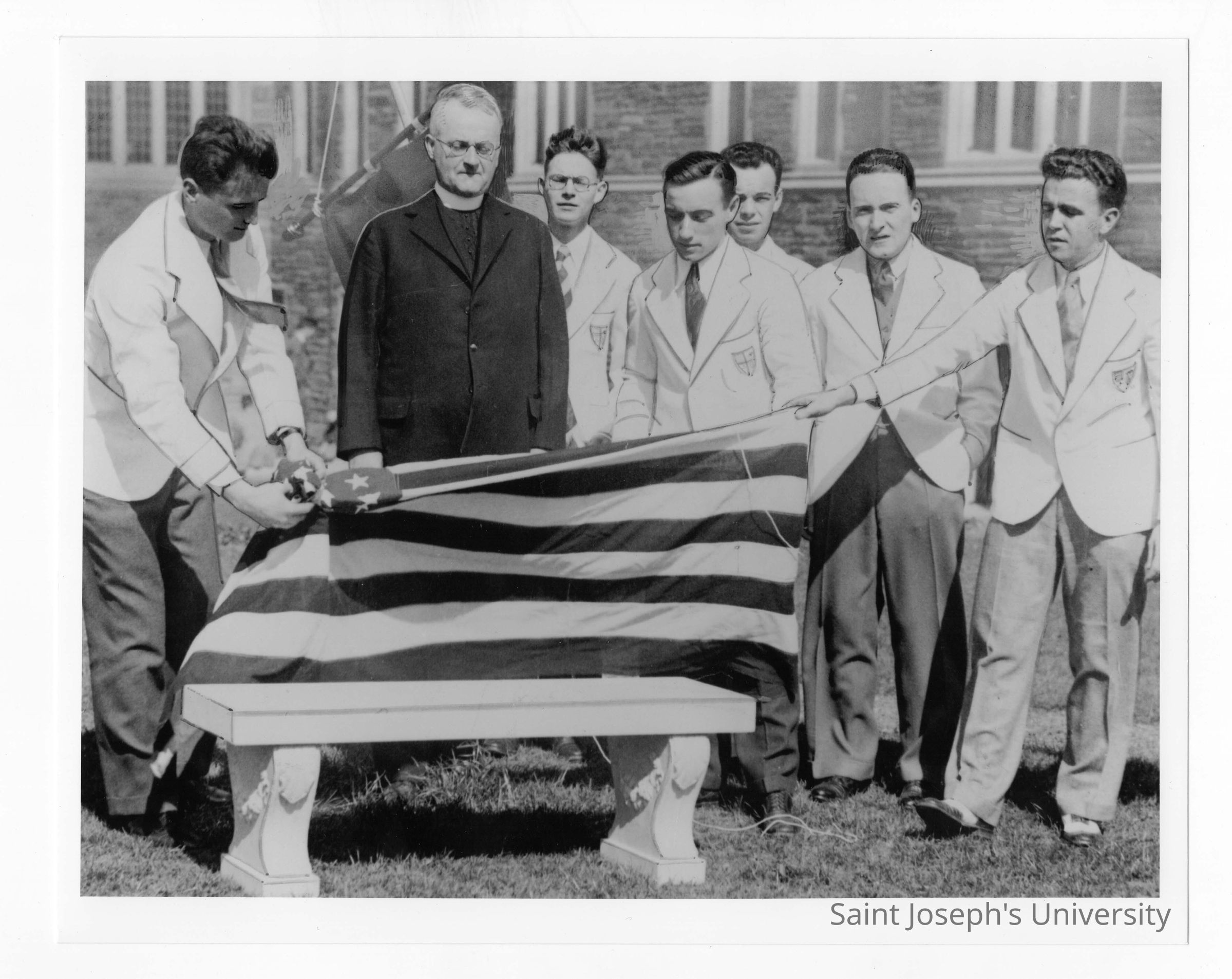 Students unveiling marble bench as part of Junior Week activities with William T. Tallon, S.J., President.