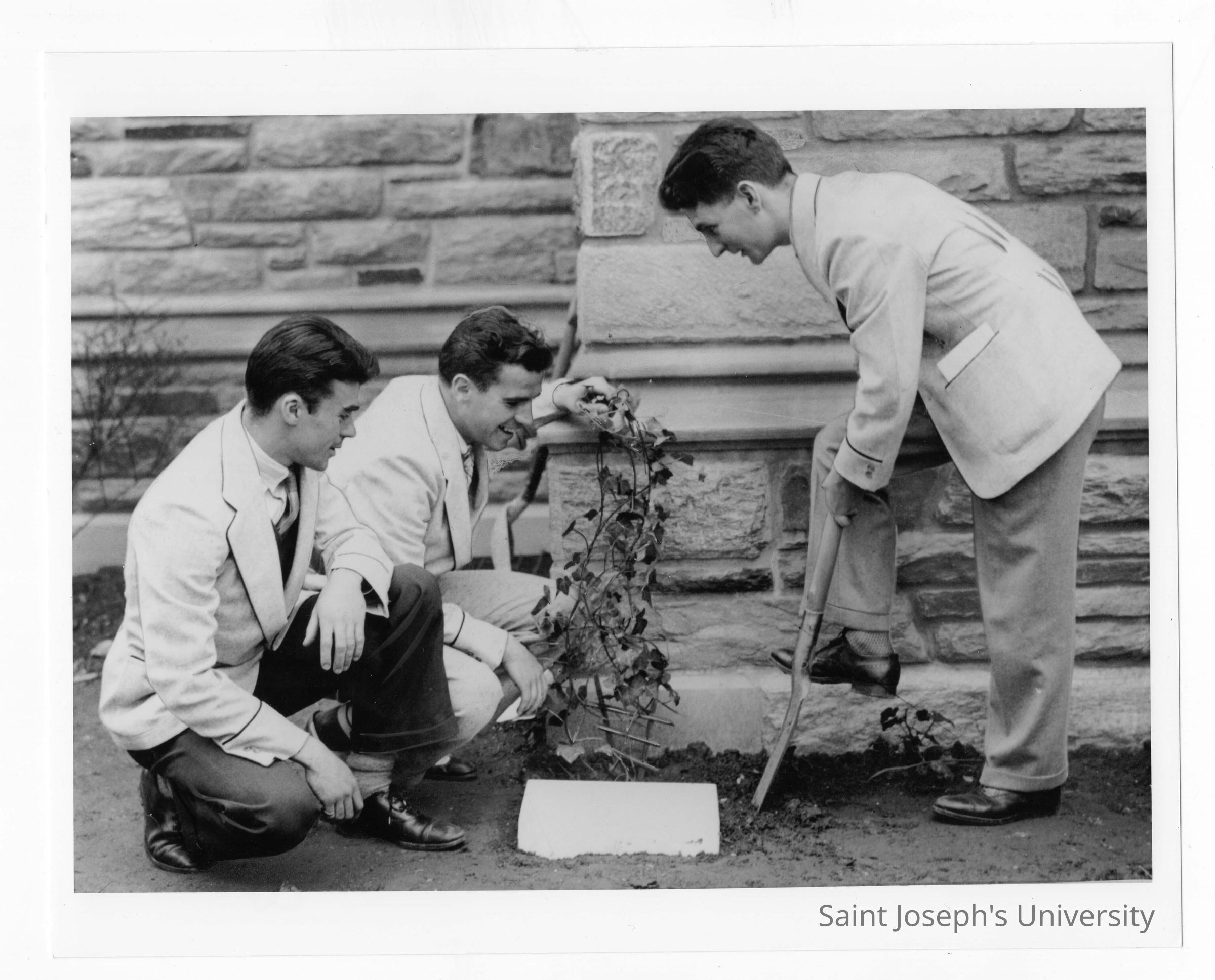 Three students participating in ceremonial planting of ivy during Junior Week activities.