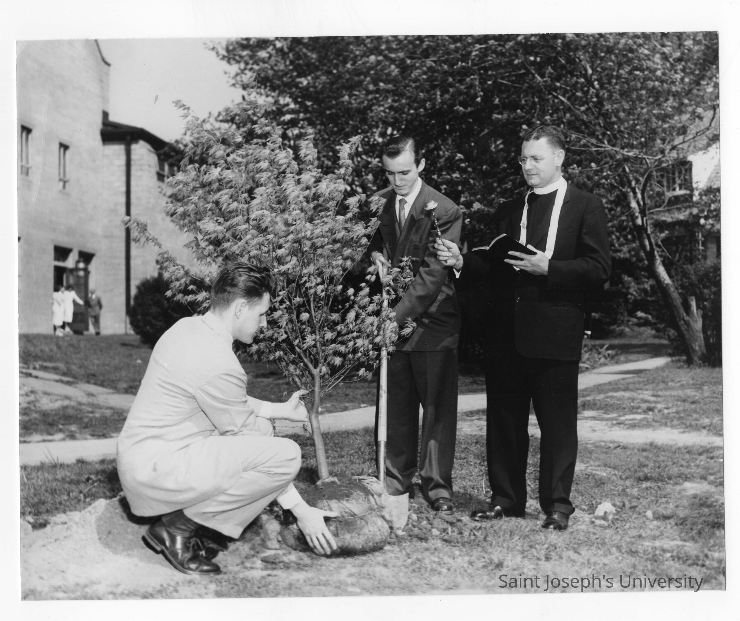Students planting tree near Field House during Junior Week activities with Edward G. Jacklin, S.J. President, c. 1952.