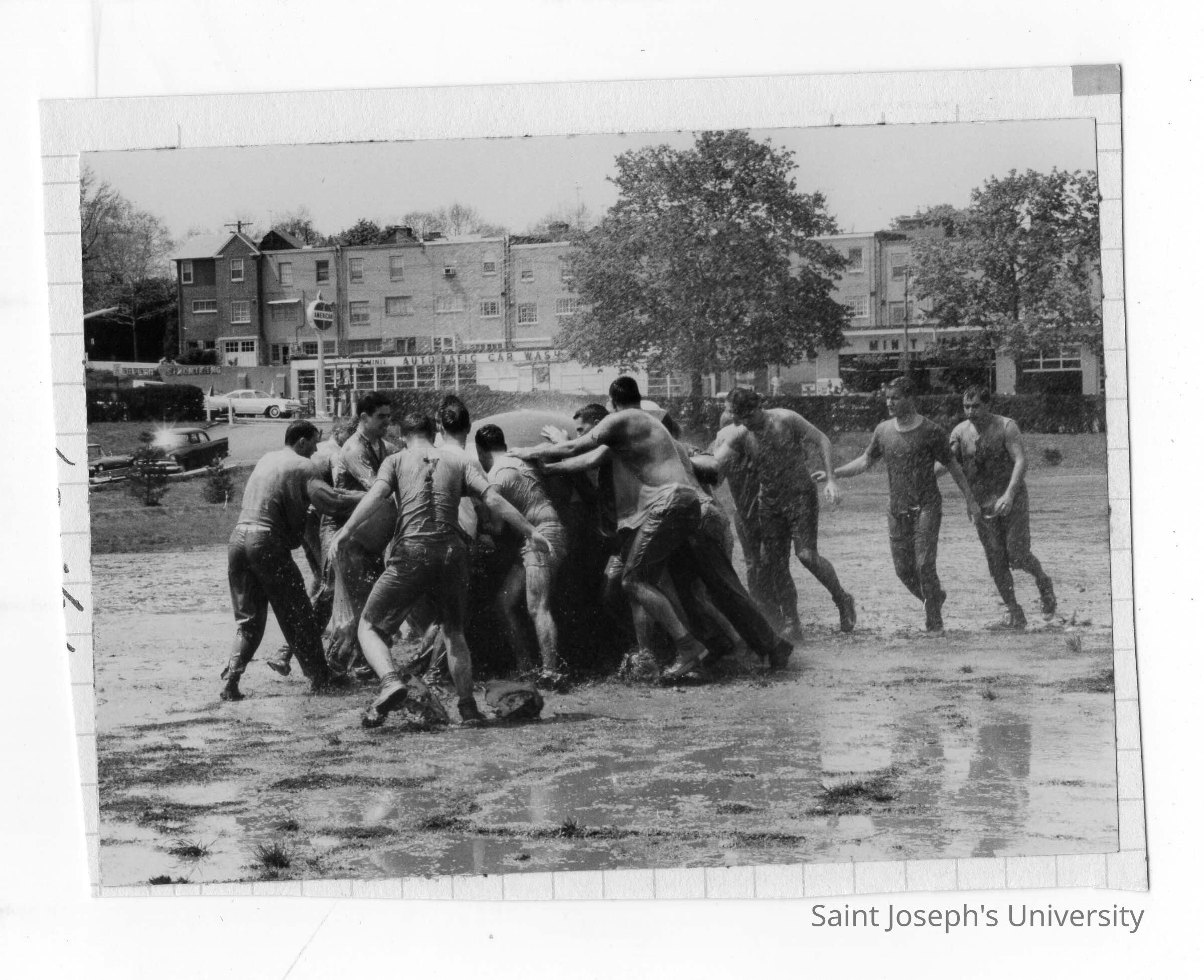 Student in pushball contest in mud during Junior Week activities.