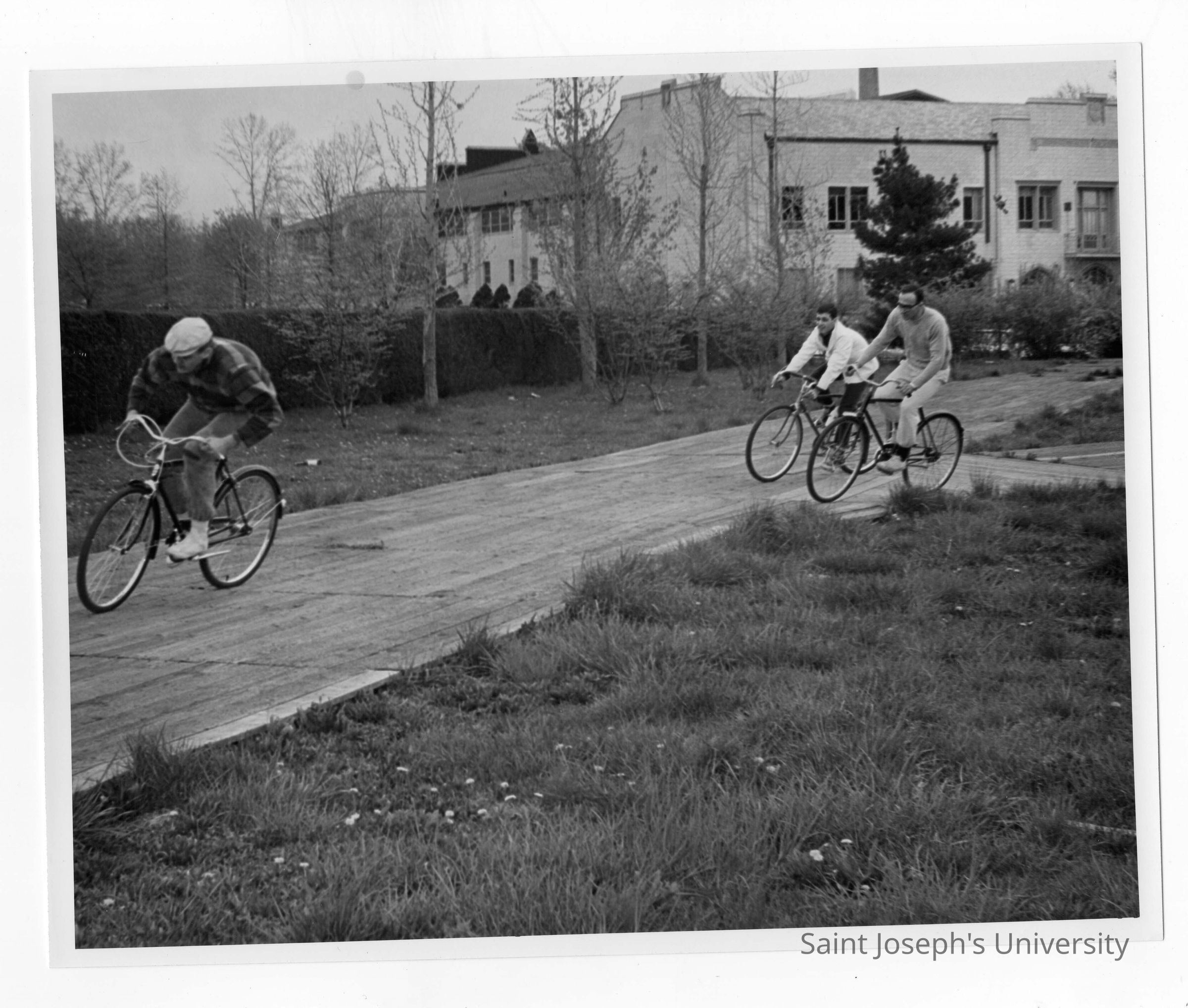Three students in bicycle race during Junior Week activities.