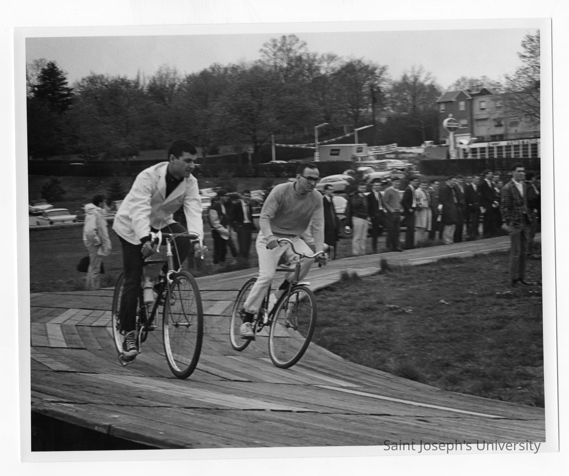 Spectators watching two students in bicycle race on wooden track near Field House during Junior Week activities.