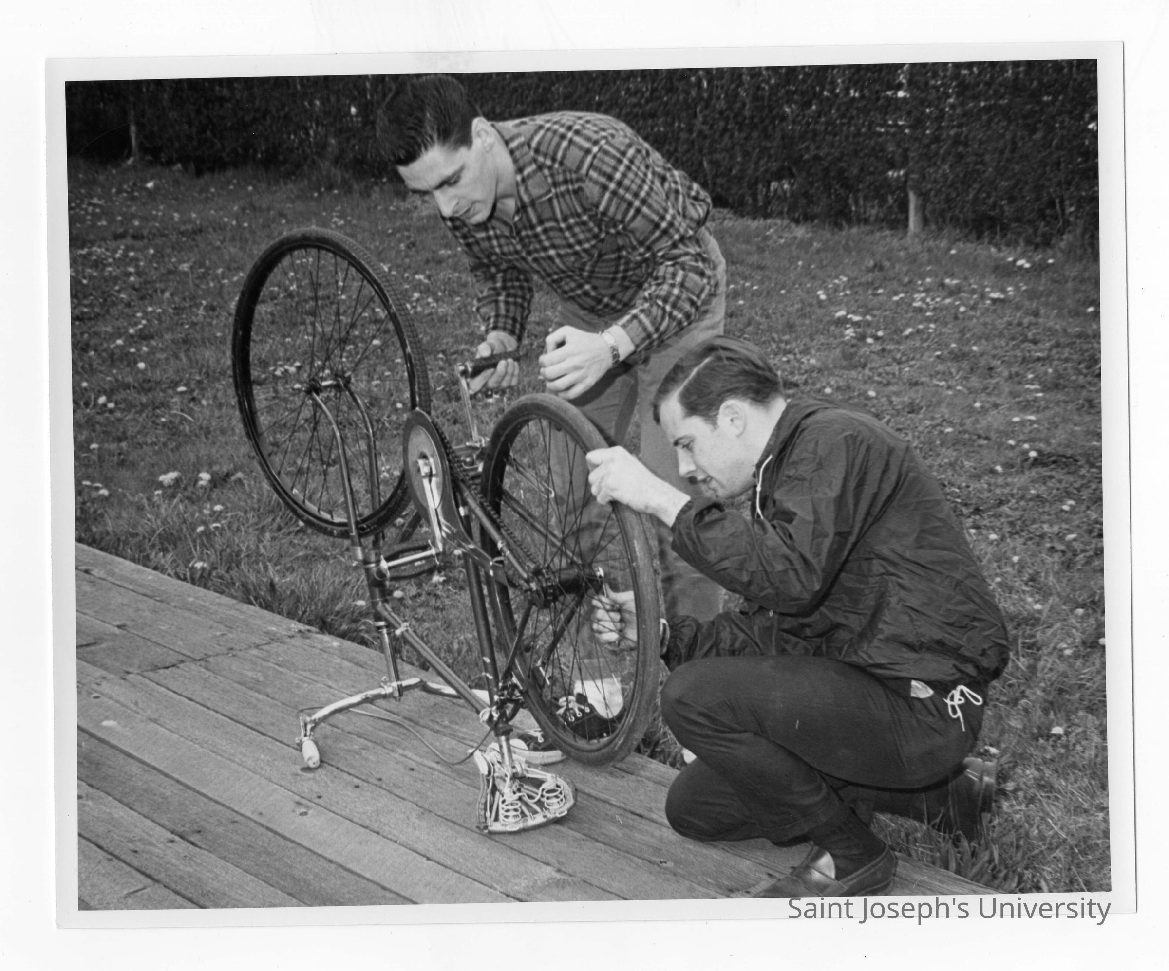 Two students preparing for bicycle race on wooden track near Field House during Junior Week activities.