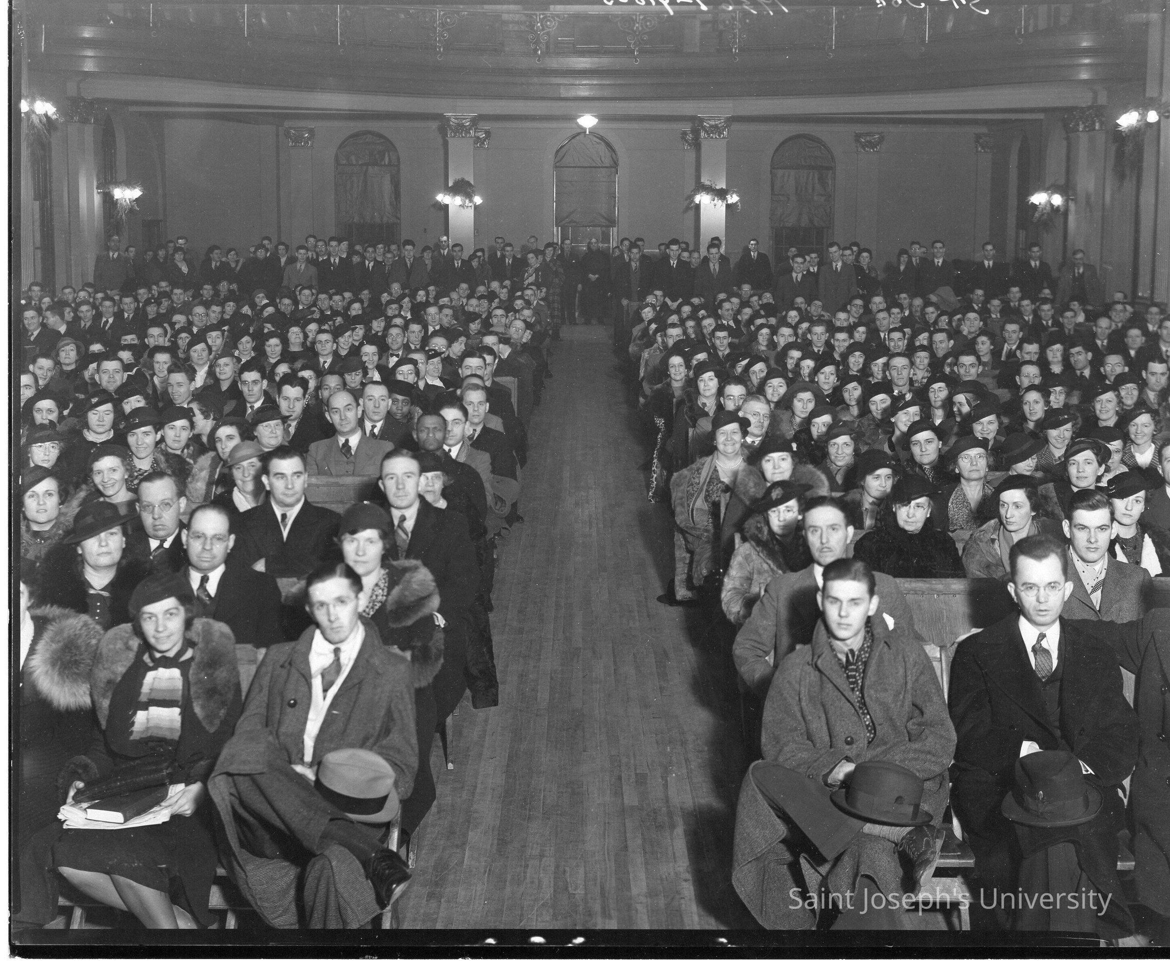 First assembly of students in School of Social Sciences. Classes were open and tuition free for both men and women.