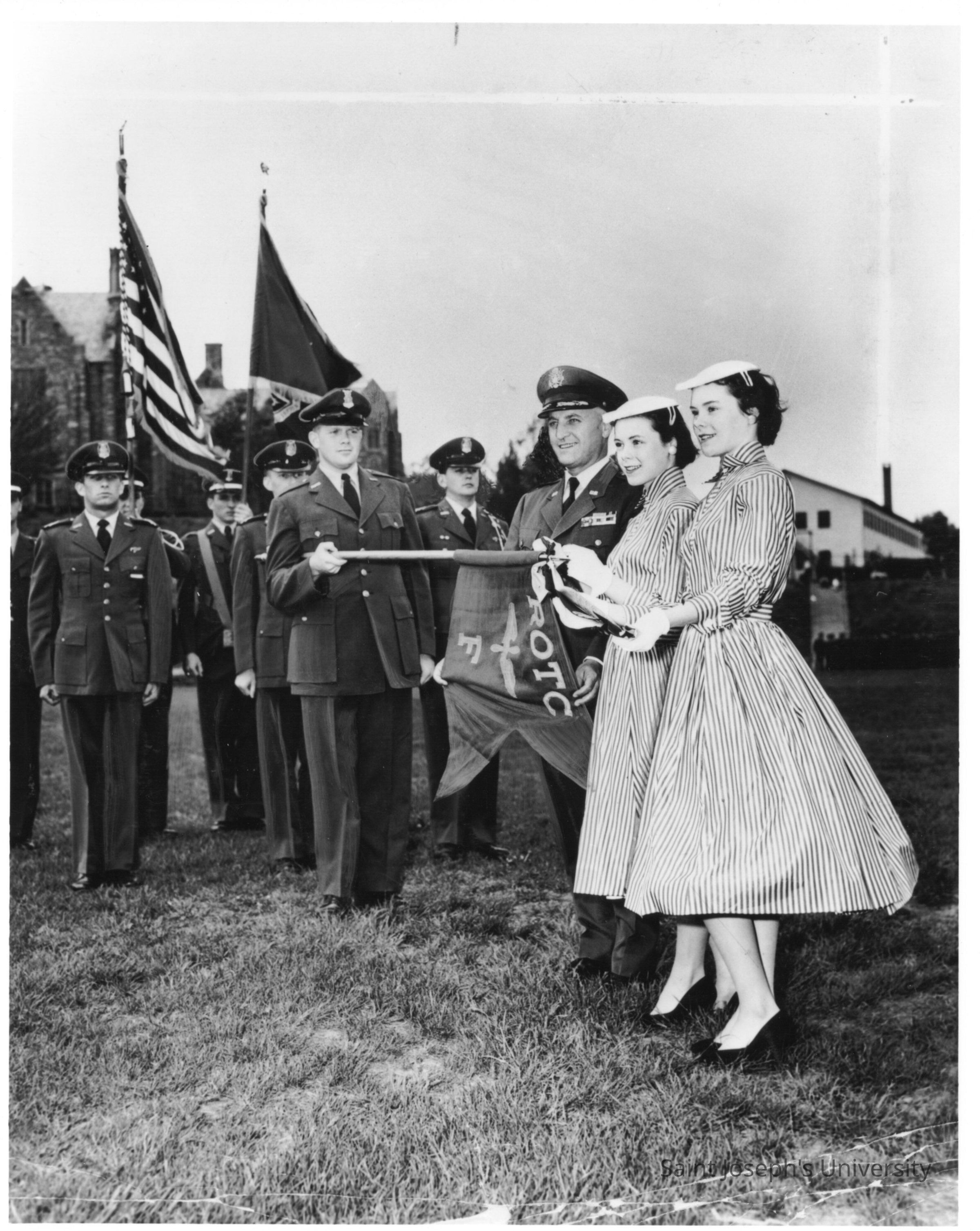 Air Force ROTC ceremony with Eileen Nolan and Kathleen Nolan (twins wearing striped dresses) and Col. James O'Connell and others.