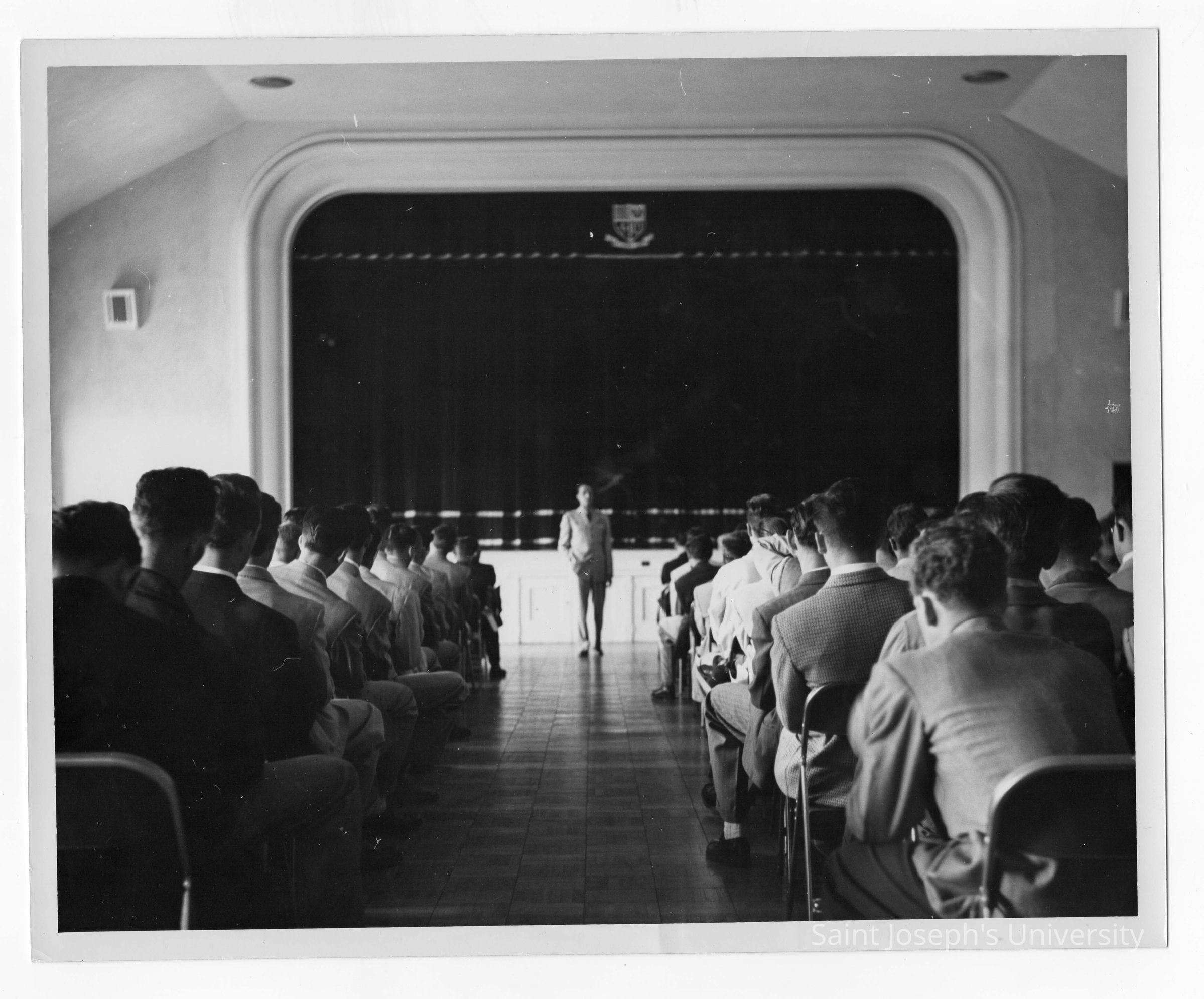 Students listening to Ray Gehrig, ROTC commander in Flanigan Auditorium.