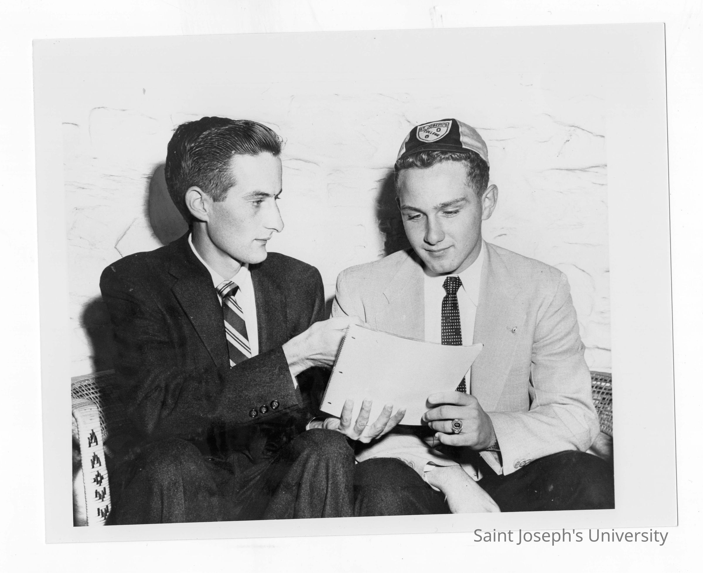 Junior student explaining college routine to new freshman student wearing cap (dink or beanie).