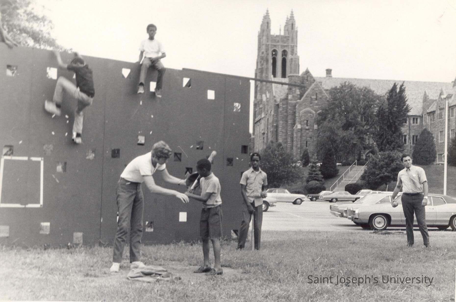 Student playing baseball with neighborhood children on SJU campus as part of community service/outreach program during summer.