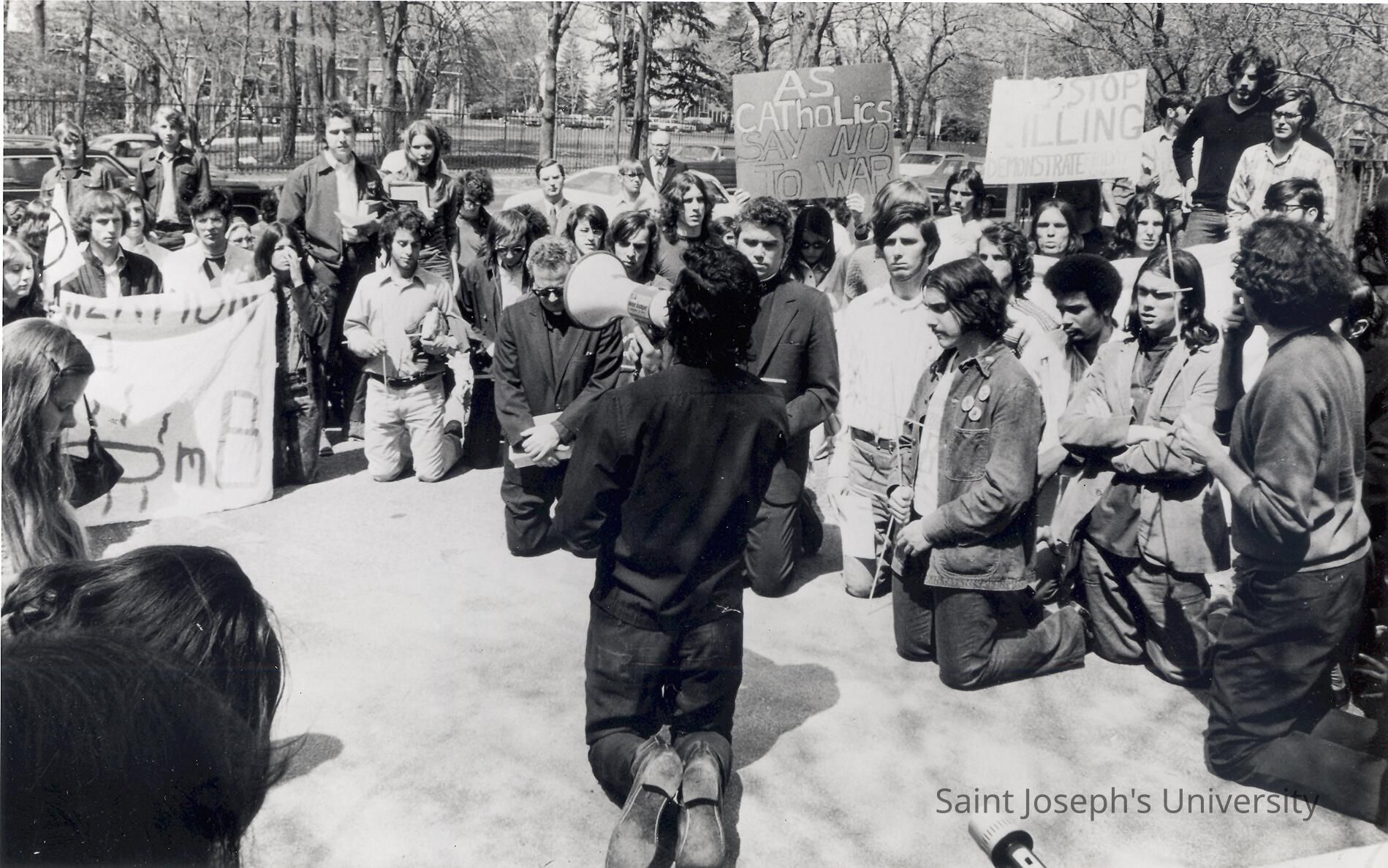 Father Tony Capizzi and Father Joseph Daoust lead student protest against Vietnam War on City Avenue.