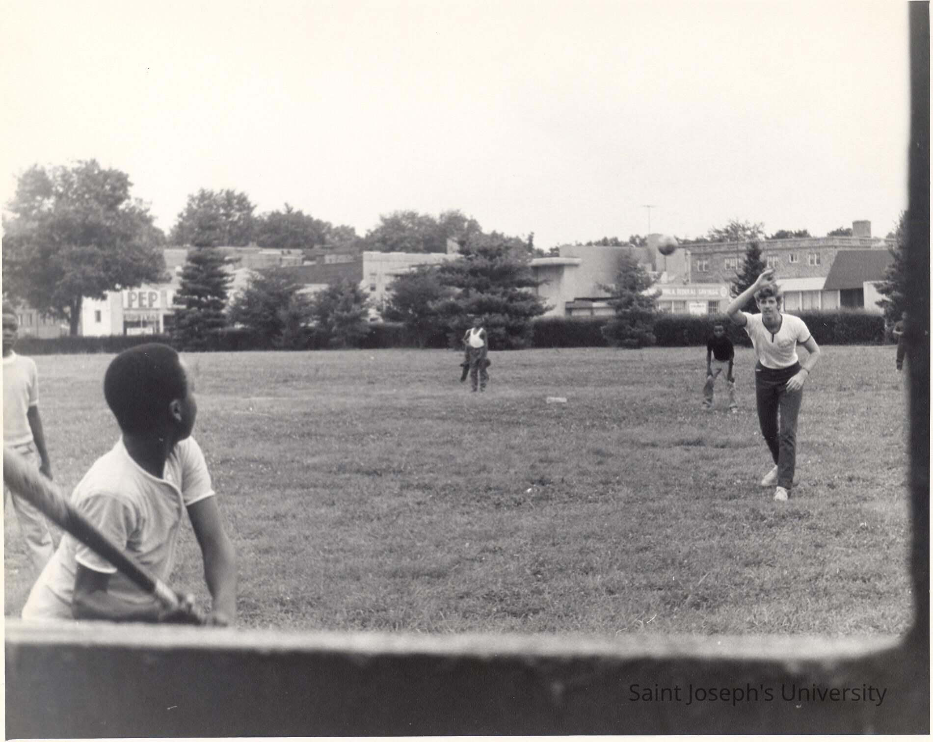 Student playing baseball with neighborhood children on SJU campus as part of community service/outreach program during summer.