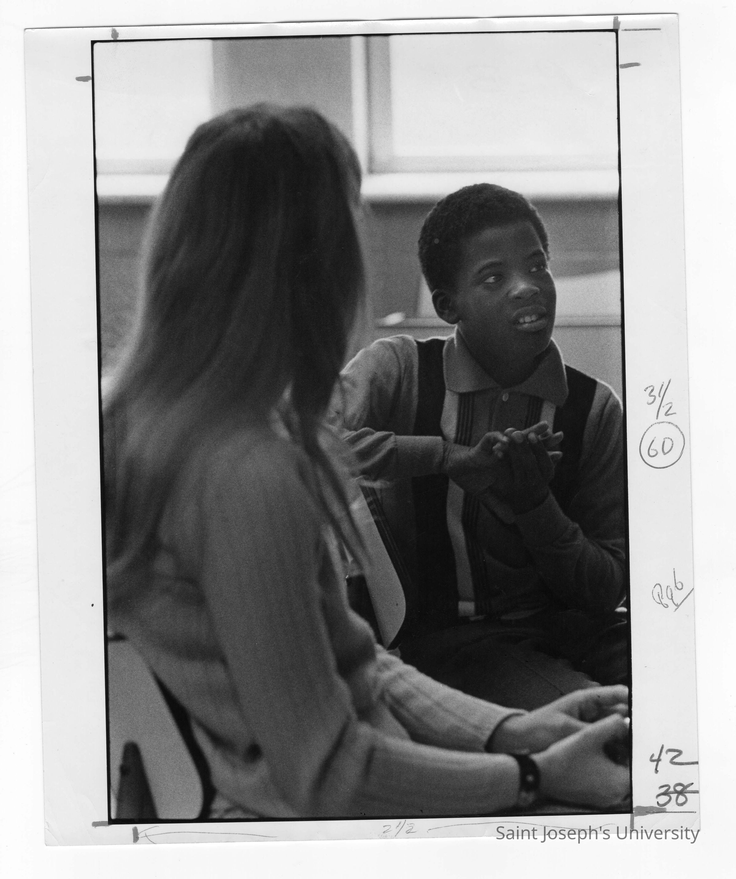 Student tutoring child at Rhoads Public School (?) as part of community service/outreach project. (Peace and Human Development program?)