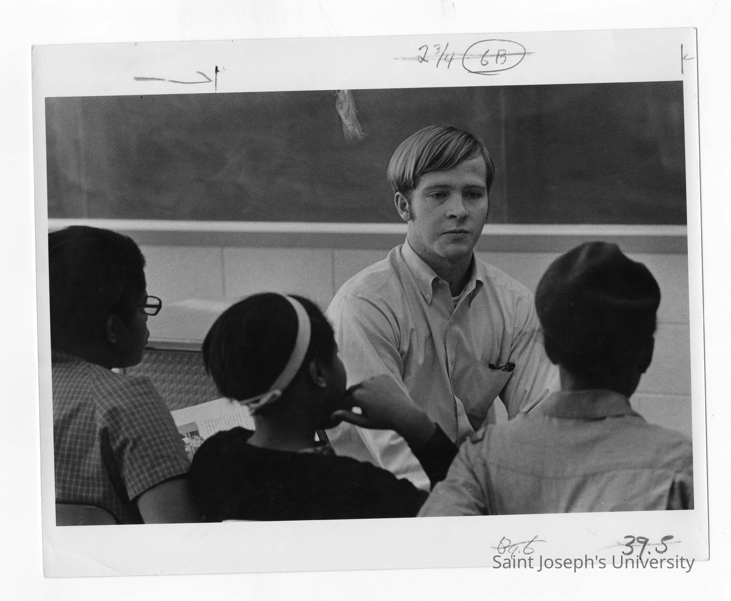 Student tutoring children at Rhoads Public School (?) as part of community service/outreach project. (Peace and Human Development program?)
