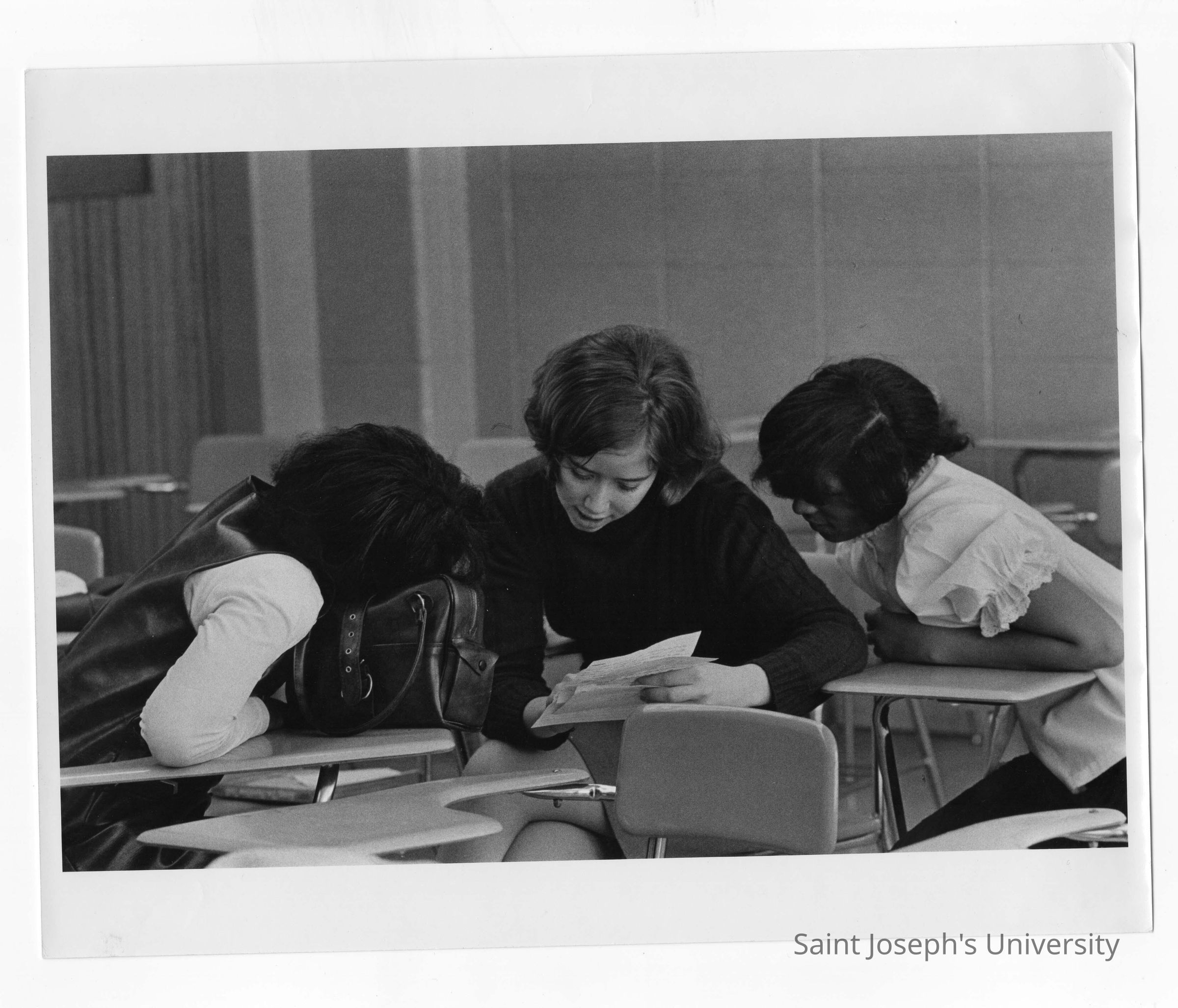 Woman student tutoring children at Rhoads Public School as part of community service/outreach project. (Part of Peace and Human Development Program?)
