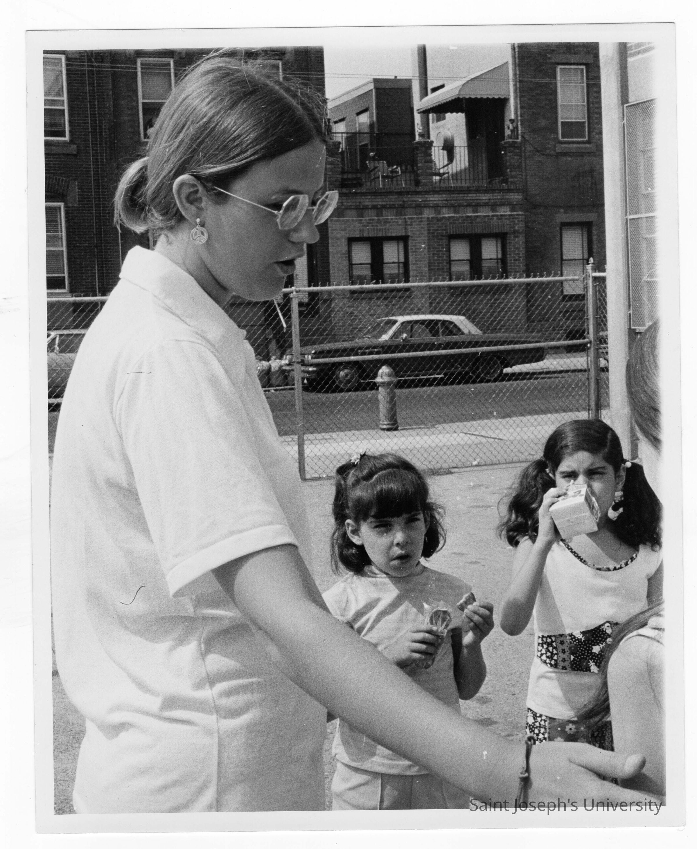 Student with children on playground as part of Mississippi summer project, a community service/outreach program (?)