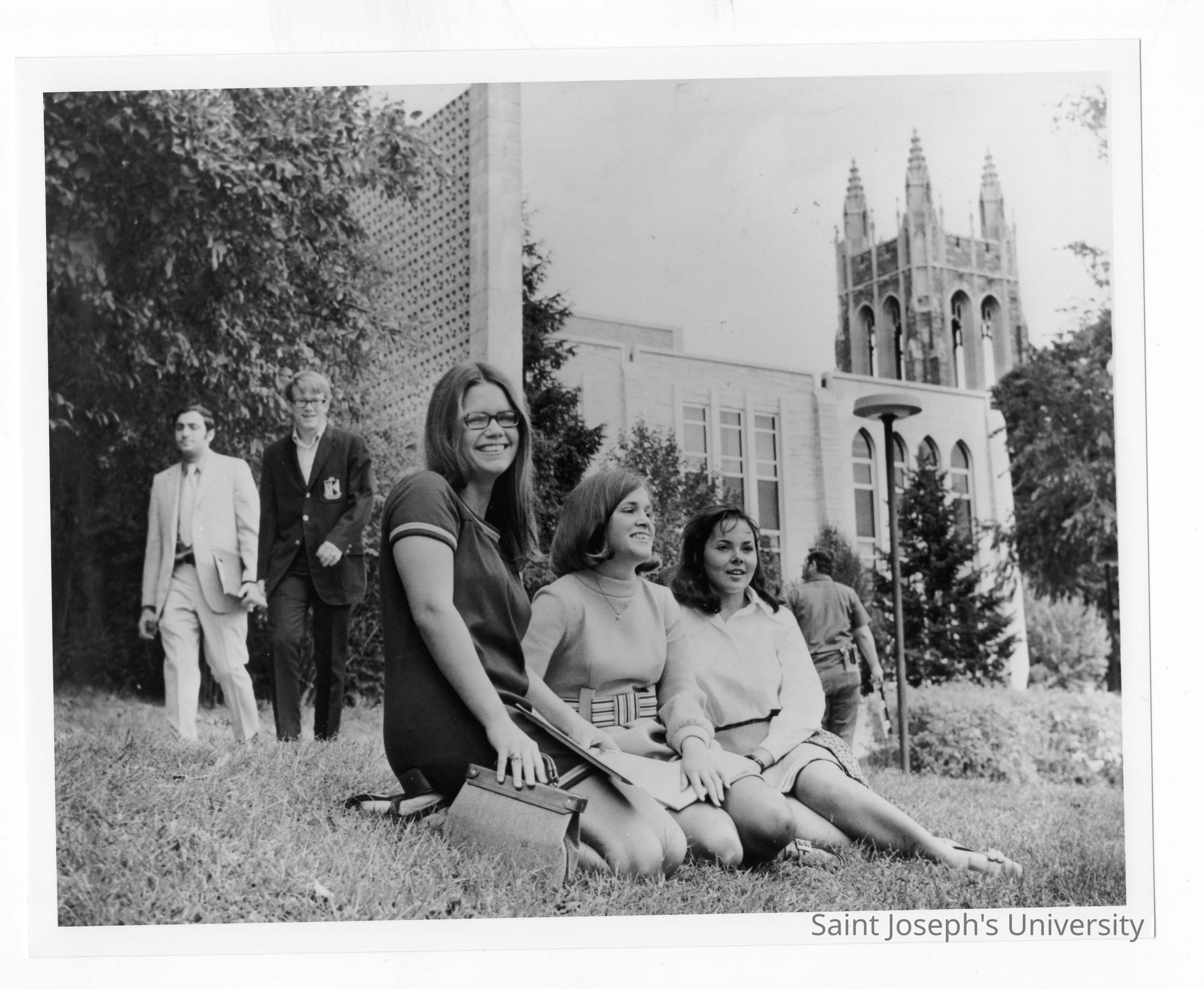 Women from first class of co-education sitting on lawn with Drexel Library in background.