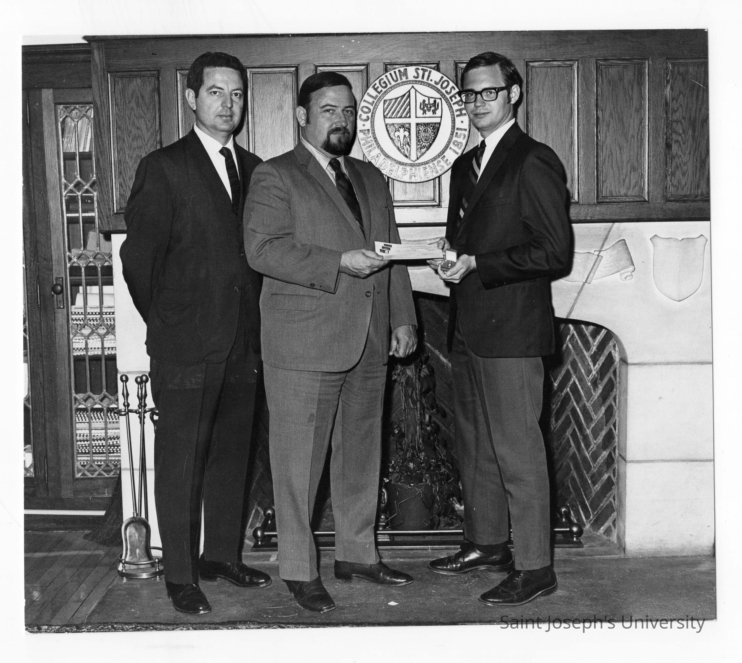 B. Thomas Blady receiving award from William Roth of Great Books of the Western World division of the Encyclopedia Britannica, with Dr. George E. Brown, assistant professor of philosophy watching.