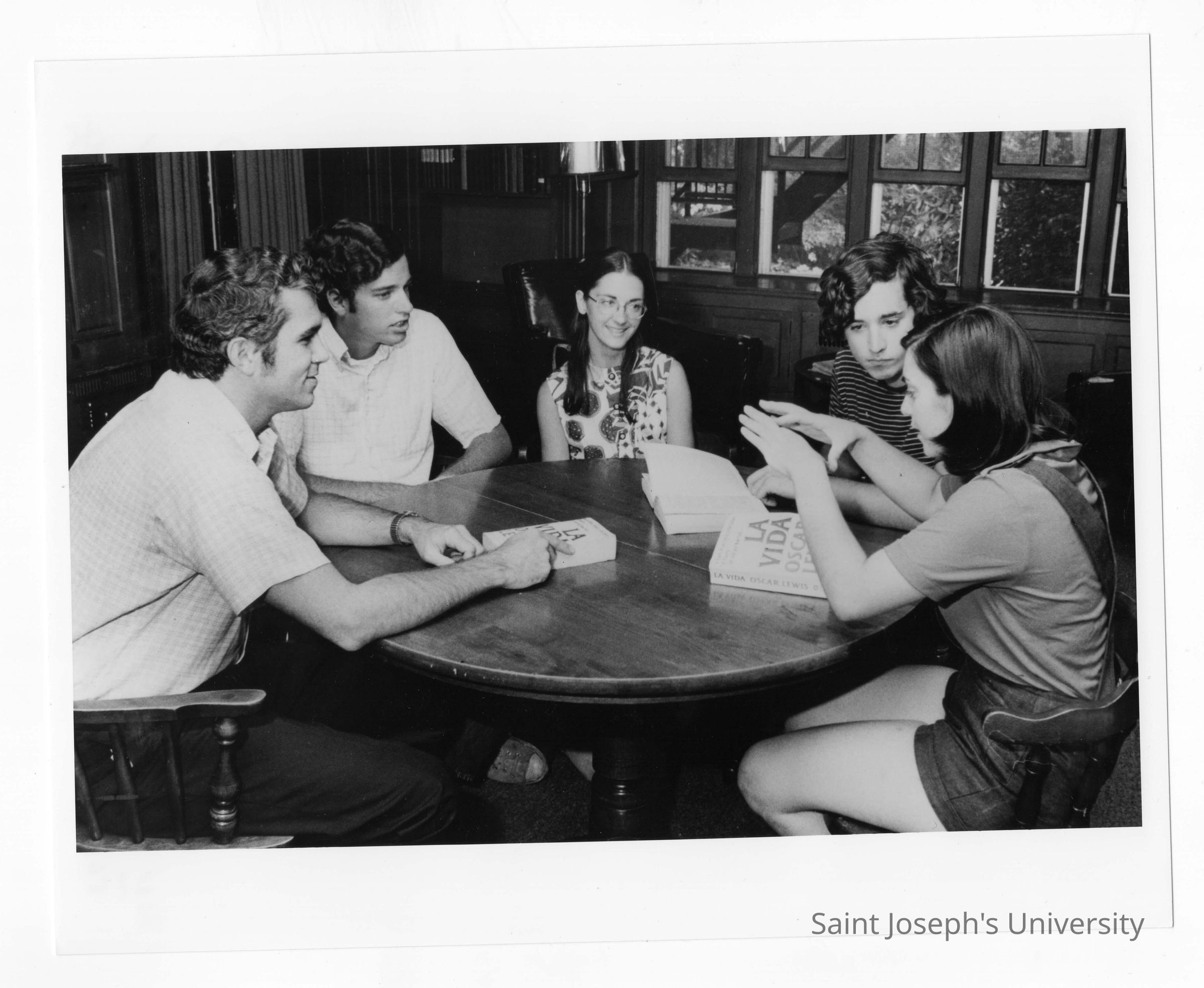 Joseph Daoust, S.J., Michael Plunkett, Paul Waerner, and others sitting around table discussing "La Vida."