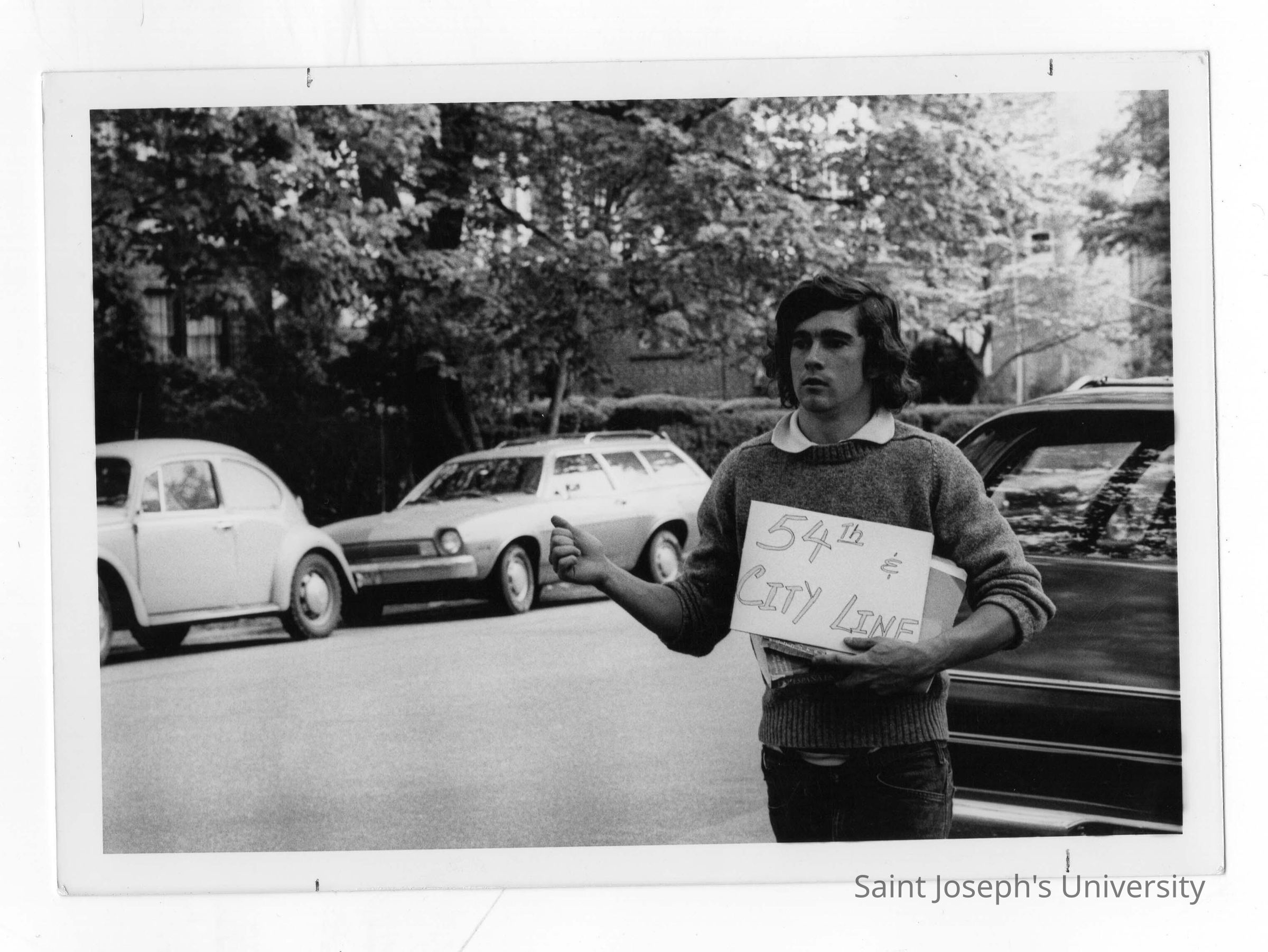 Student hitchhiking holding sign saying 54th and City Line.