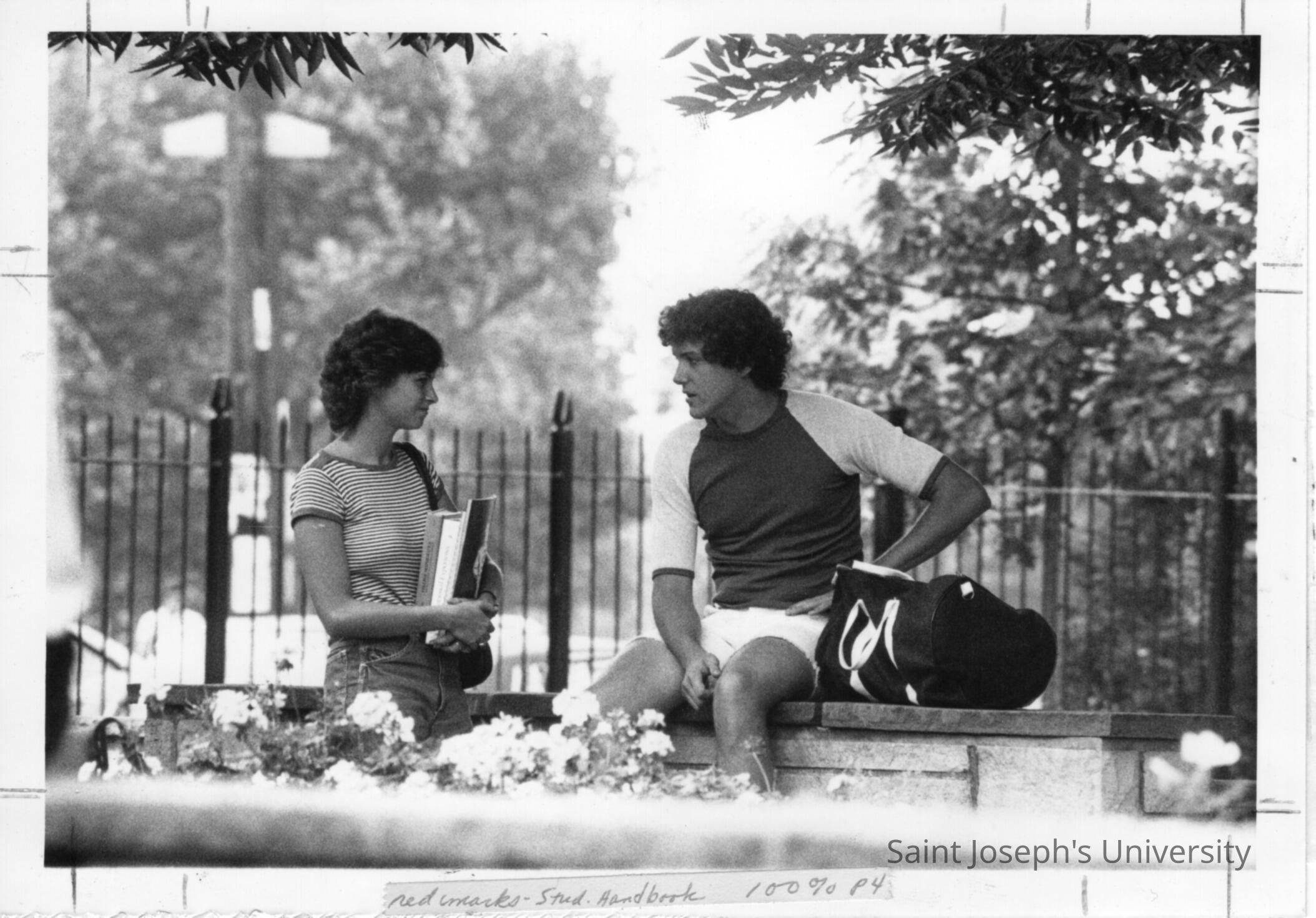 Two students talking alongside wall in spring.