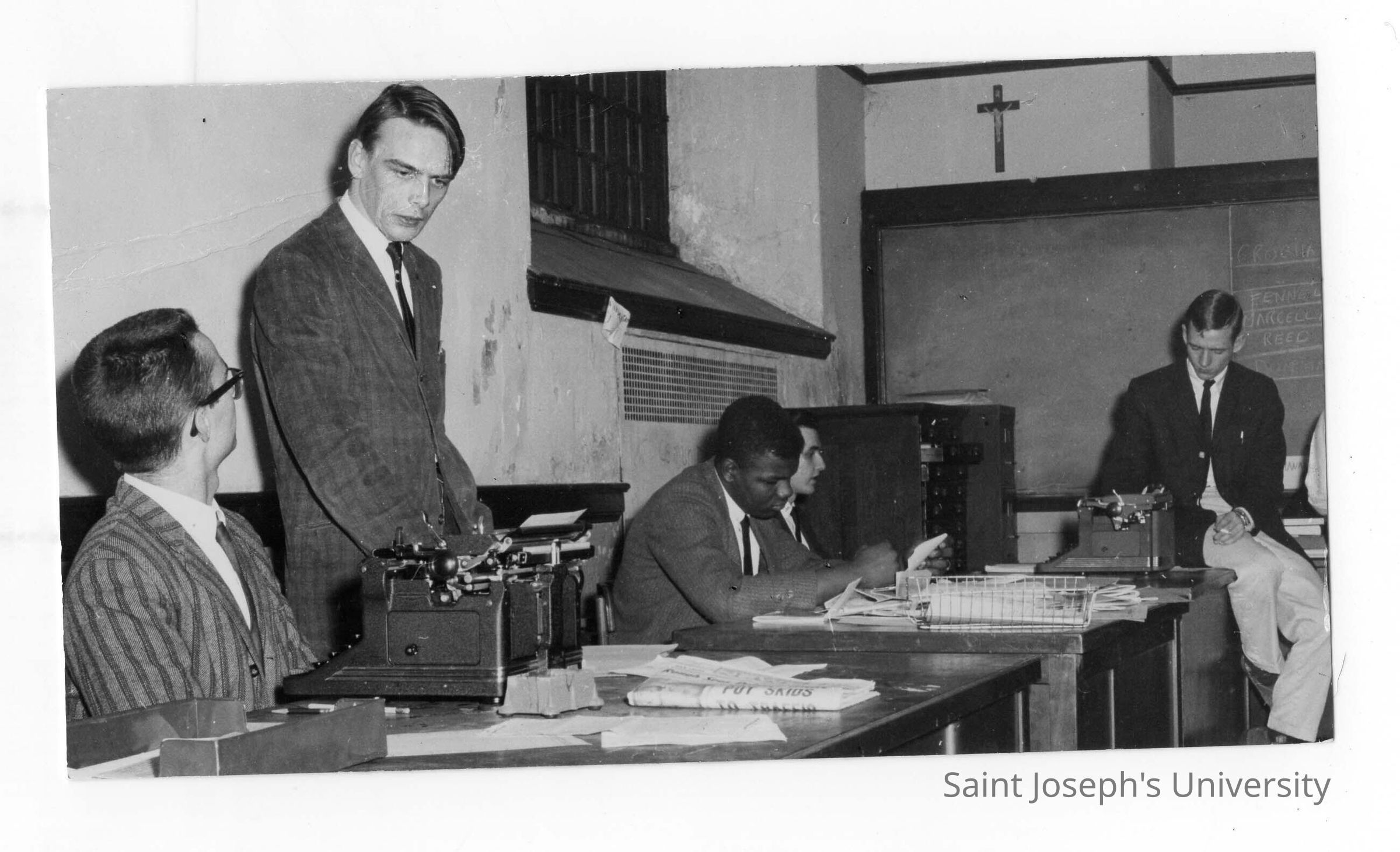 Student members of The Hawk newspaper staff working at desk with manual typewriters.