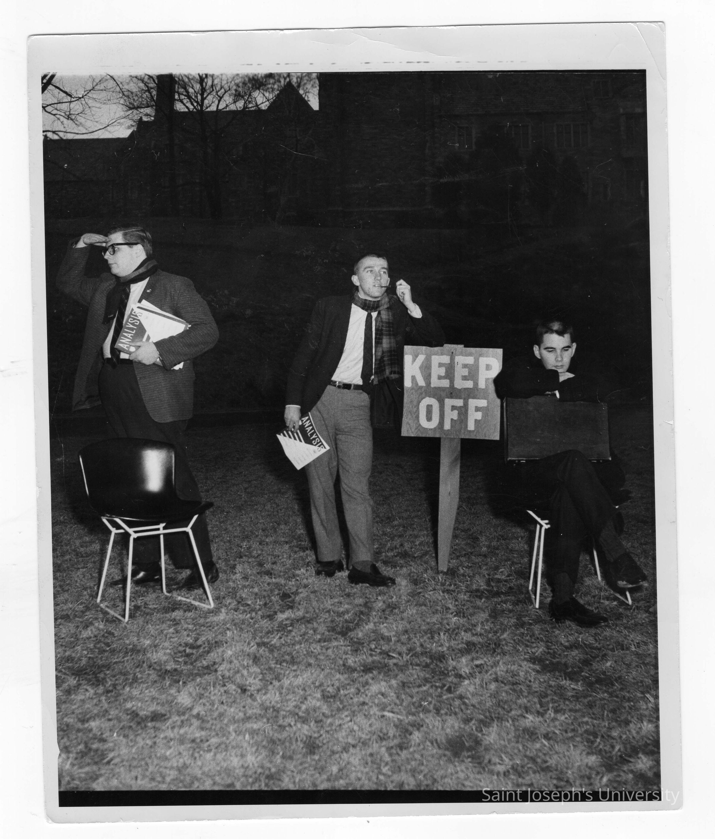 Student prank with John Lehman, Frank Hargedon, and Dick Corliss around Keep Off sign.