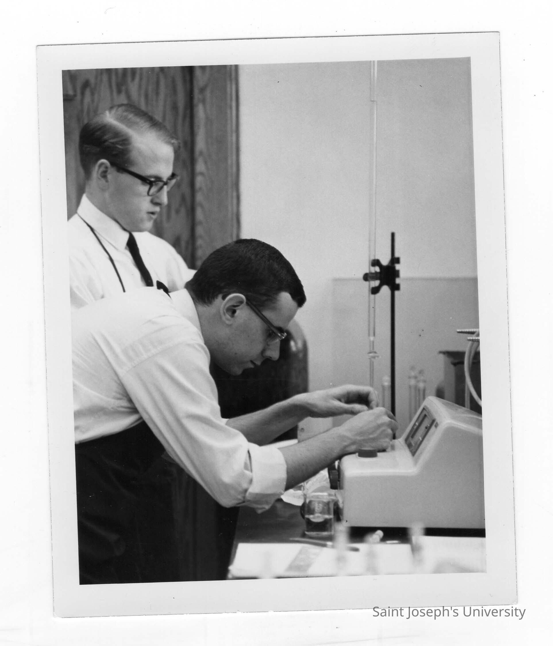 Two male students in shirt and ties conducting experiment in science laboratory.
