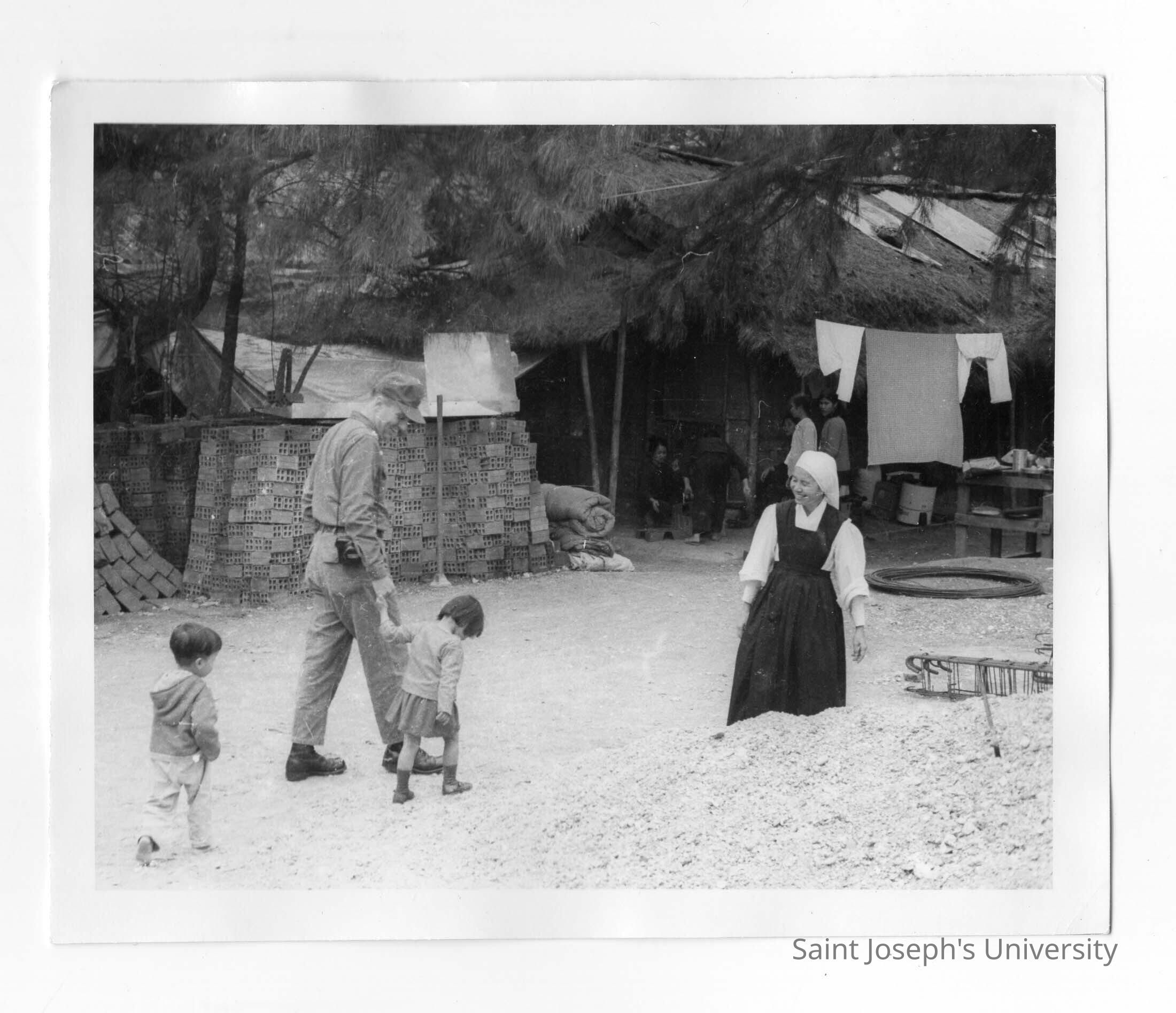 U.S. soldier with two Vietnamese orphans and Vietnamese nun.