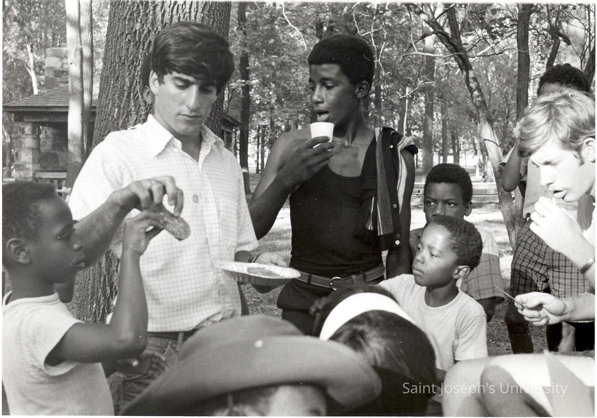 Michael DiBerardinis and Joseph Daoust, S.J. (?) helping in recreation program as part of community service/outreach summer project in "The House" or SJC Commune at 17th and Girard Streets, Philadelphia.