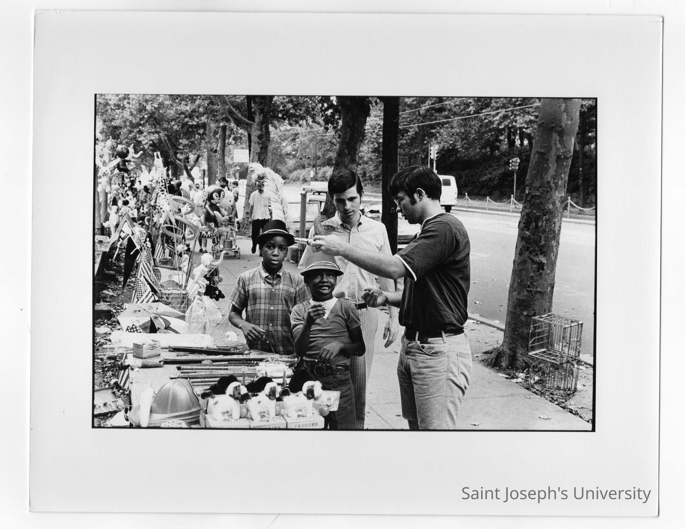 Students from "The House" or SJC Commune at 17th and Girard Streets, Philadelphia, with neighborhood children at street fair.
