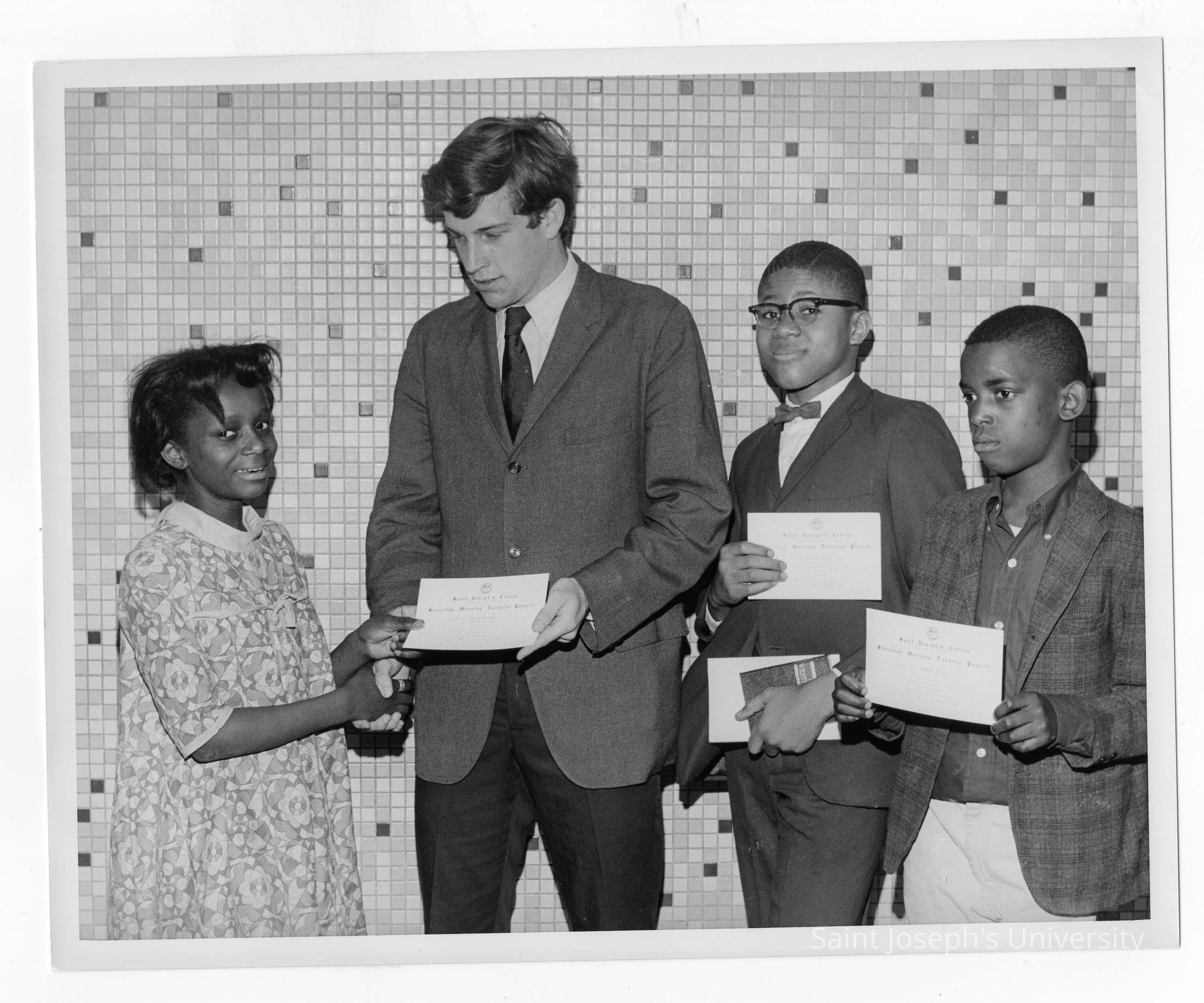 Children from Rhoads Public School receiving certificates/awards from student Tim Plunkett as part of student community service/outreach tutoring project.