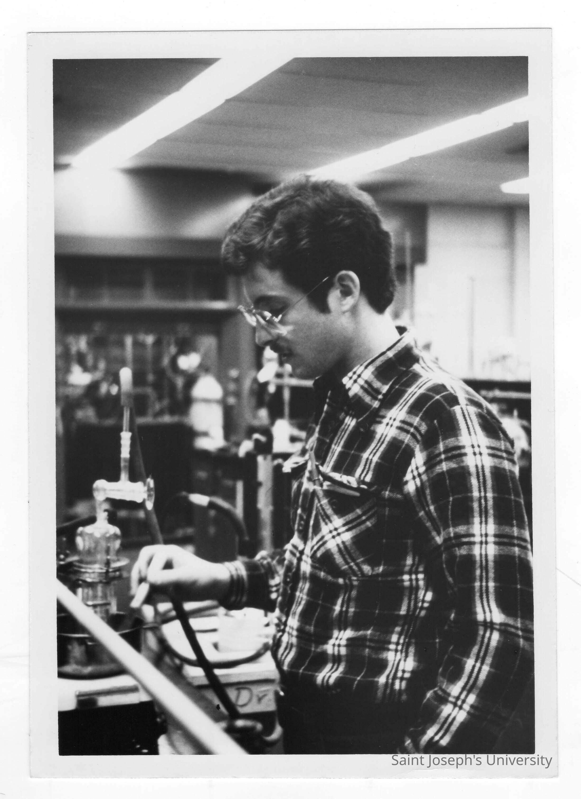 Male student conducting experiment in science laboratory.