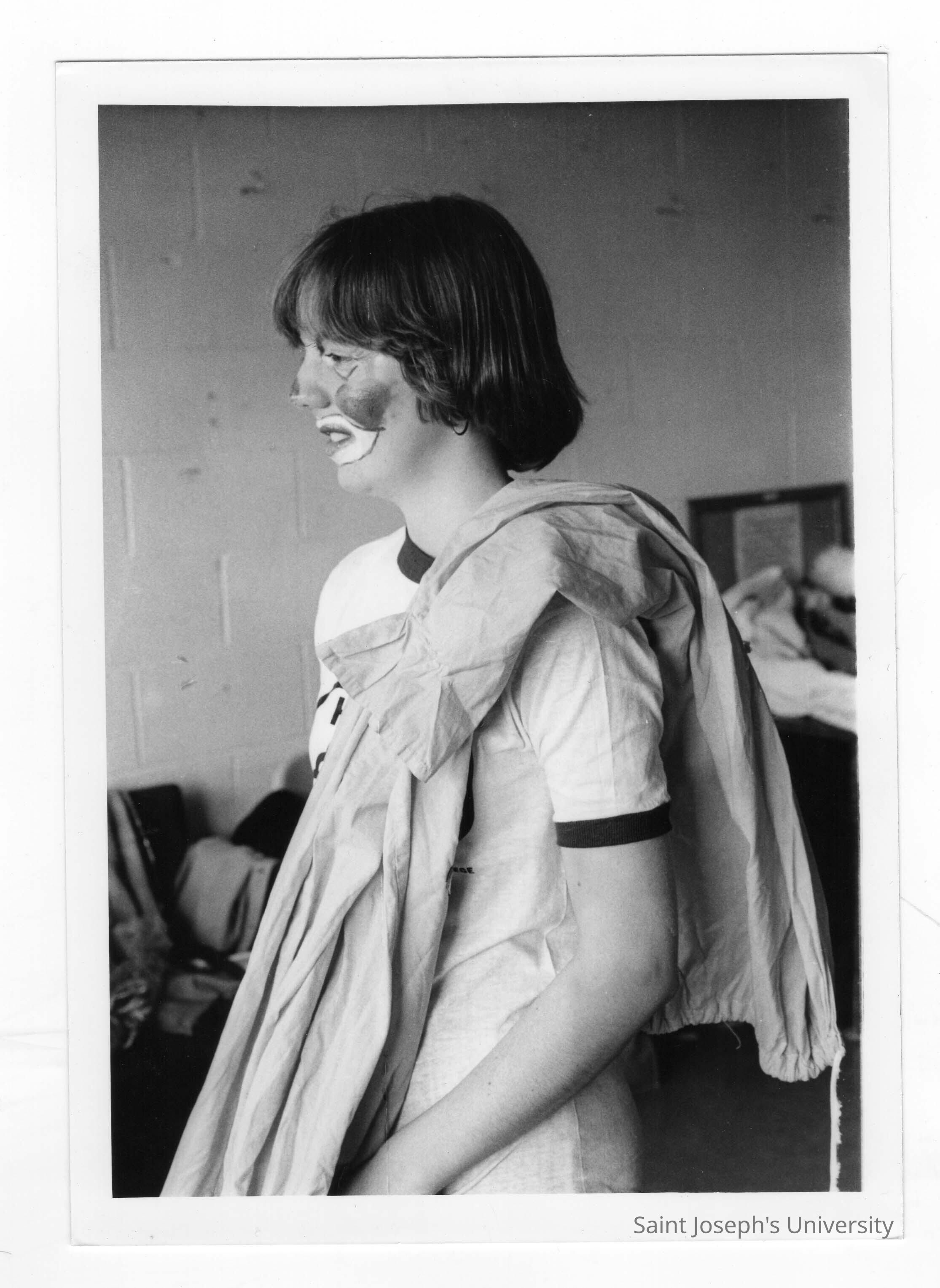 Student, Chris Sweeney (?), with face painted as clown in Hand-in-Hand event, a community service/outreach project.
