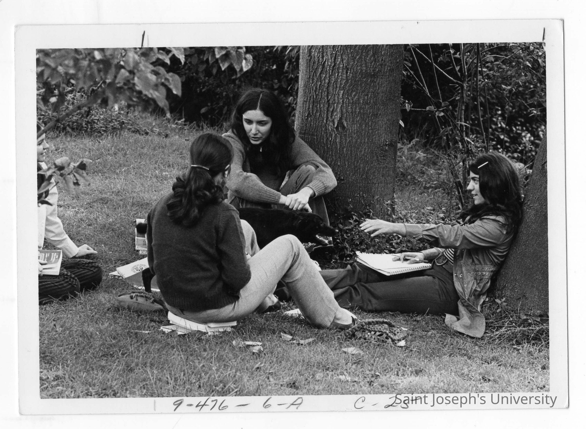 Four women students talking and studying on lawn under trees.