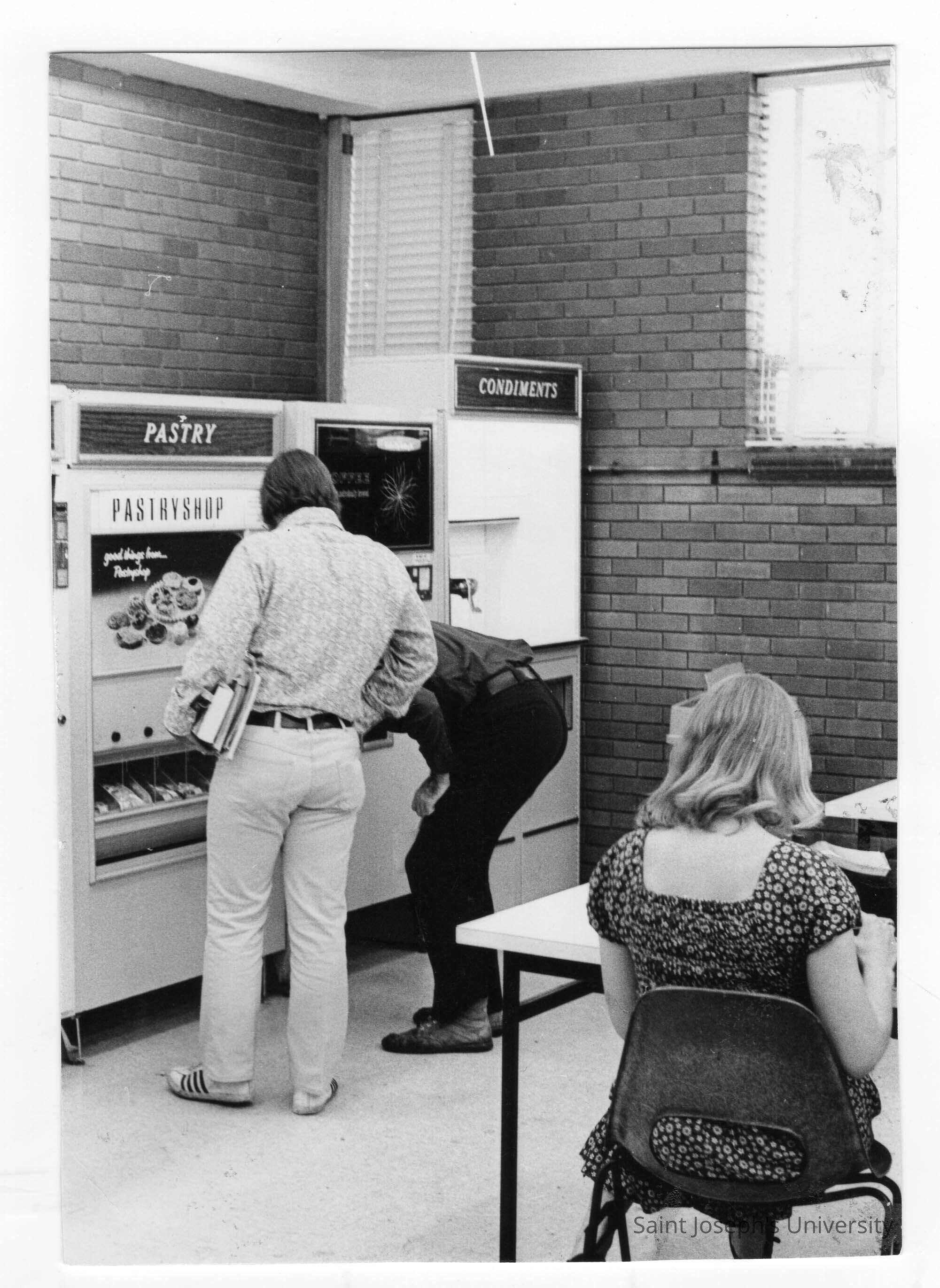 Students in lounge area buying food from pastry and condiments vending machines.