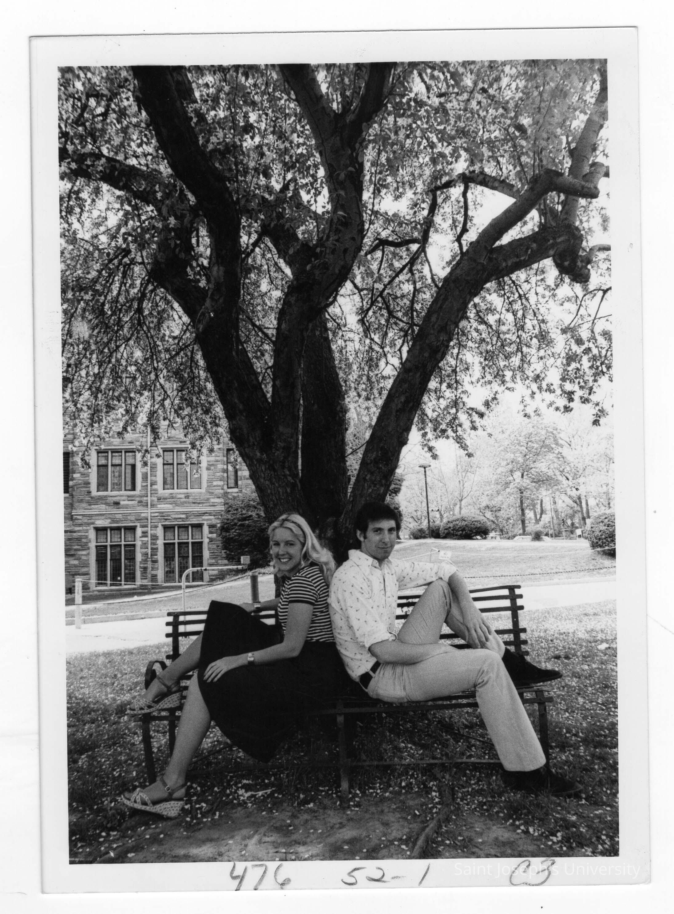 Two students sitting on park bench under tree near Barbelin building in spring.