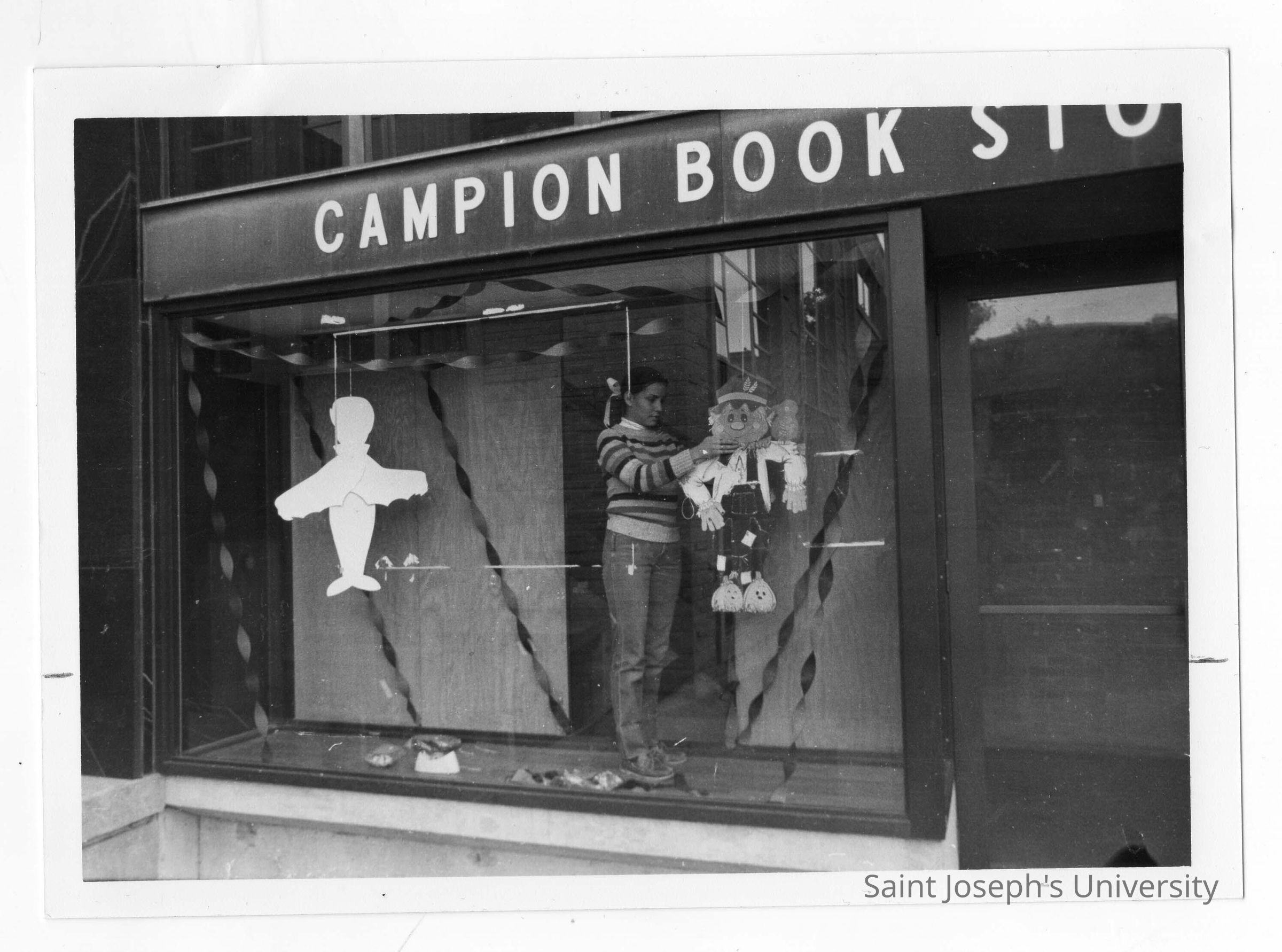 Student standing in Campion bookstore window putting up Halloween decorations.
