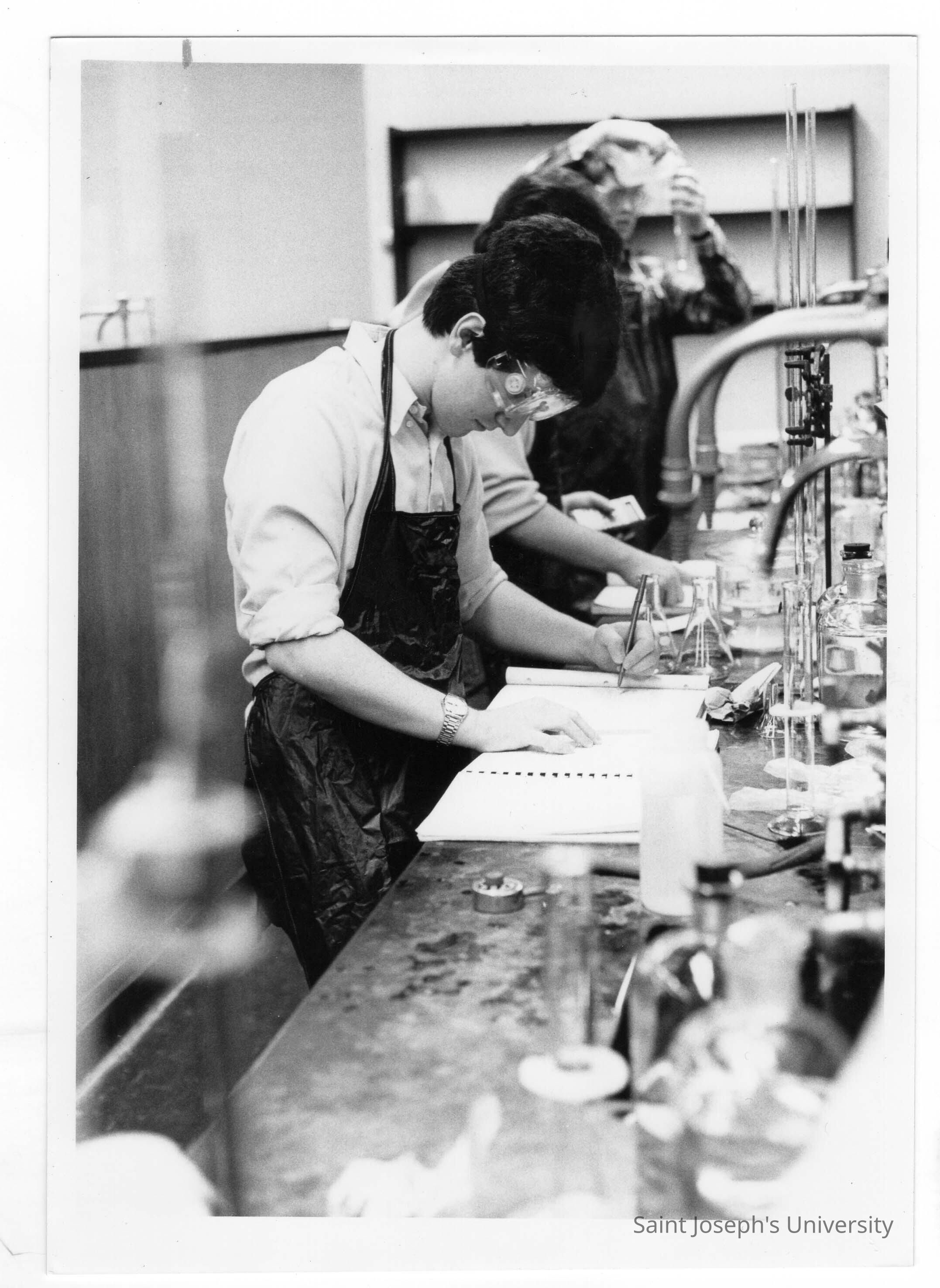 Students wearing aprons and goggles conducting experiment in science laboratory.