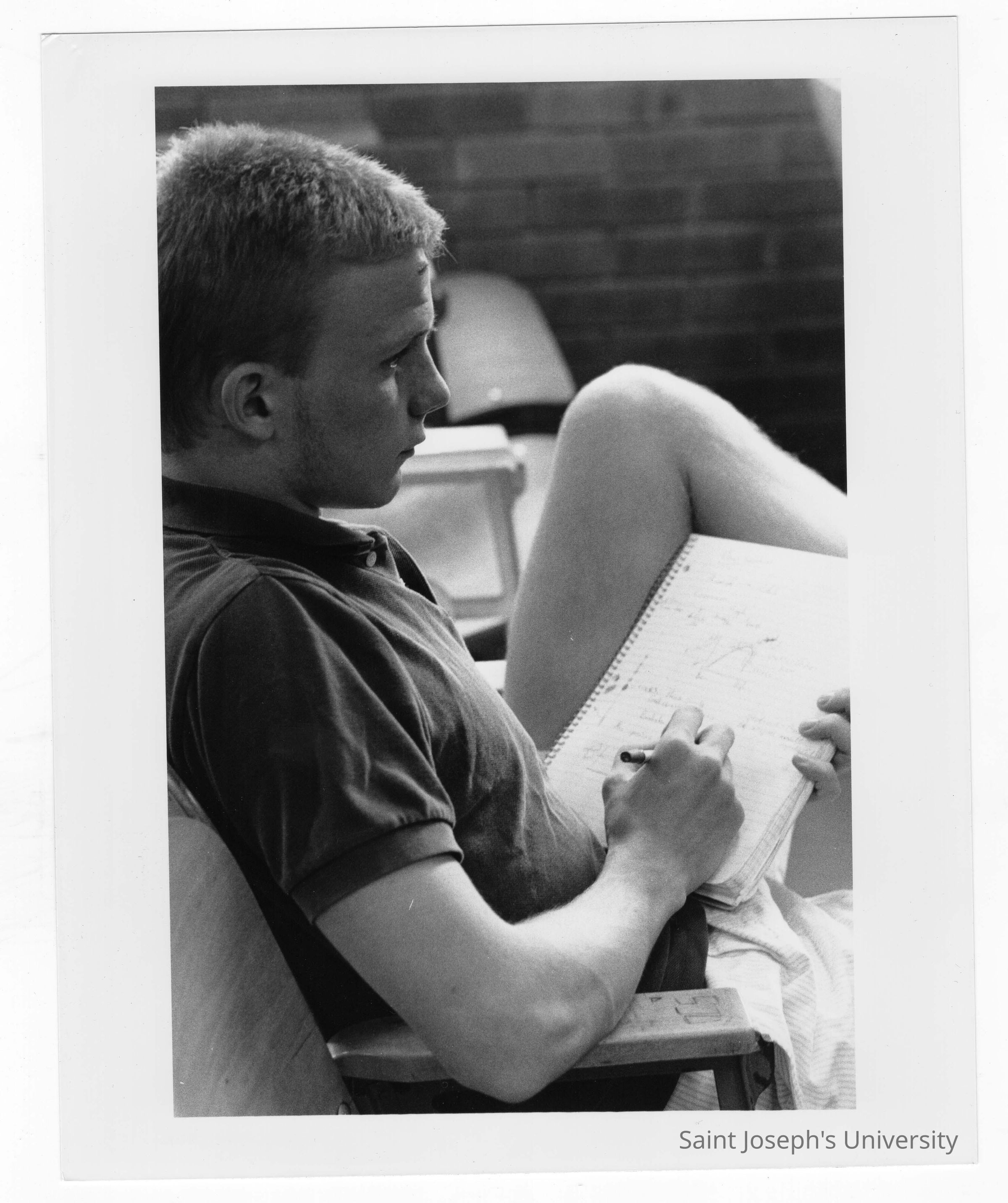 Male student taking notes during lecture.