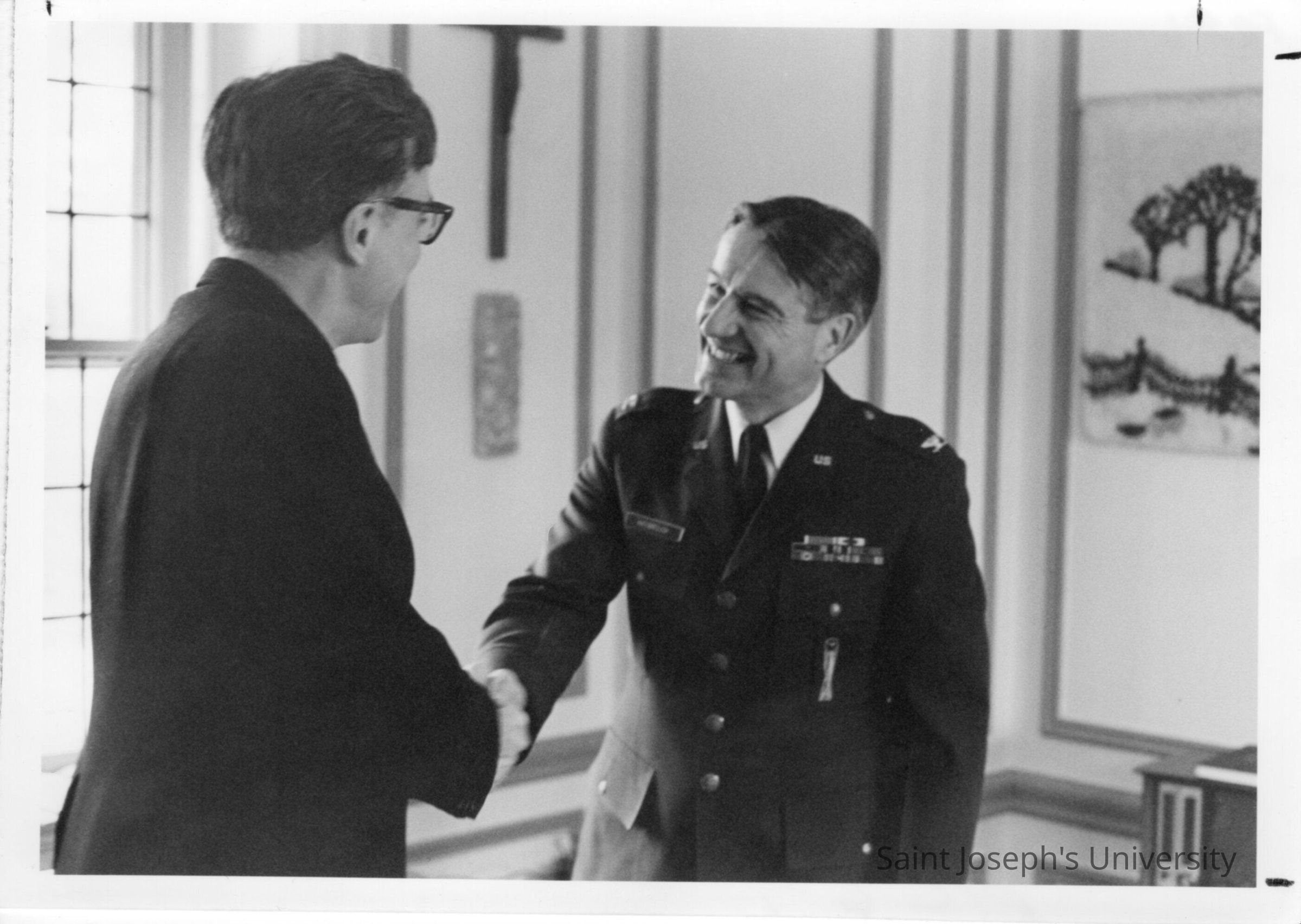 Donald I. MacLean, S.J. shaking hands with Air Force ROTC commander.