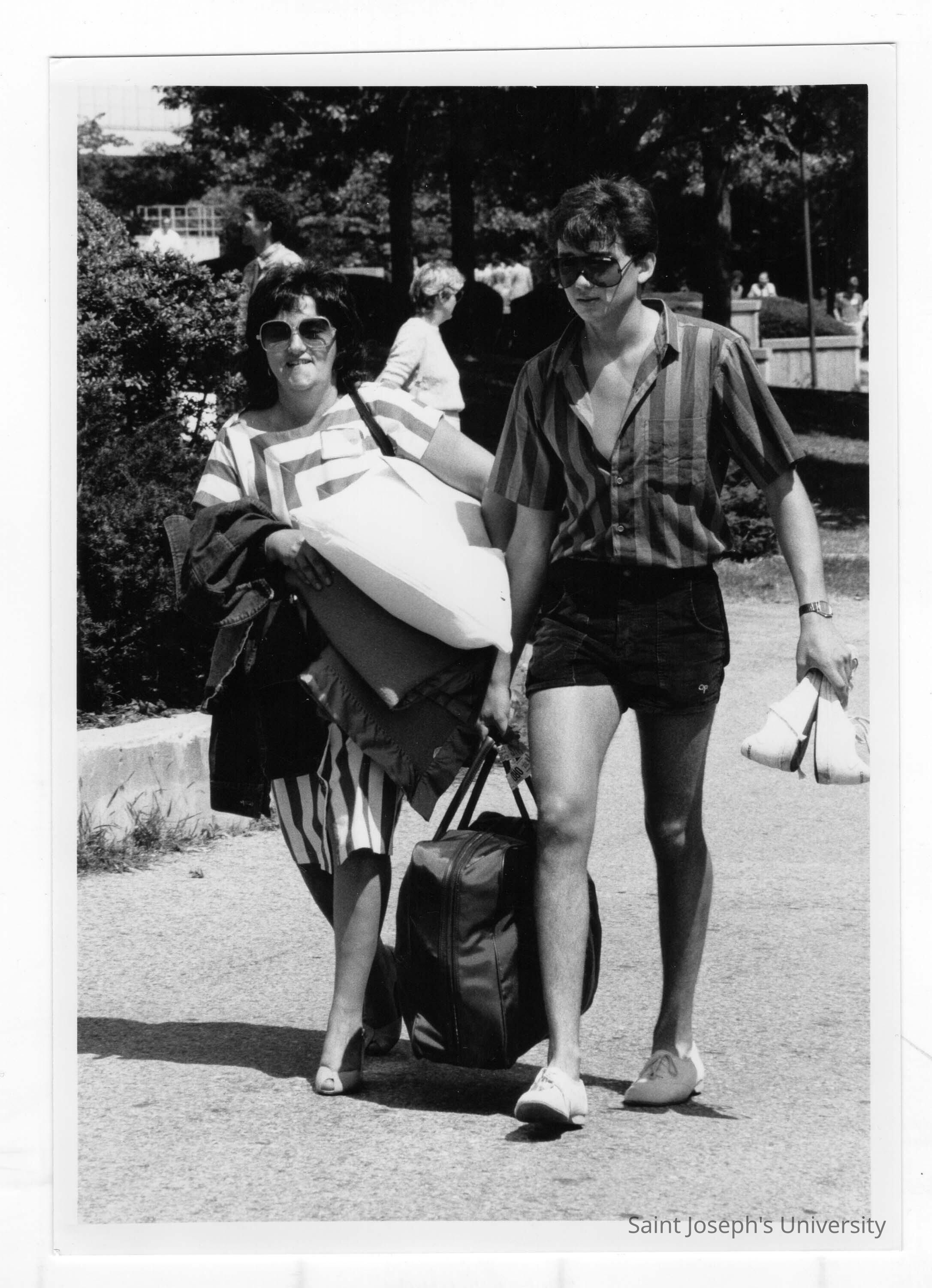 Male student and his mother packing and leaving at end of year? She is dressed in striped dress and he is dressed in striped shirt and shorts.