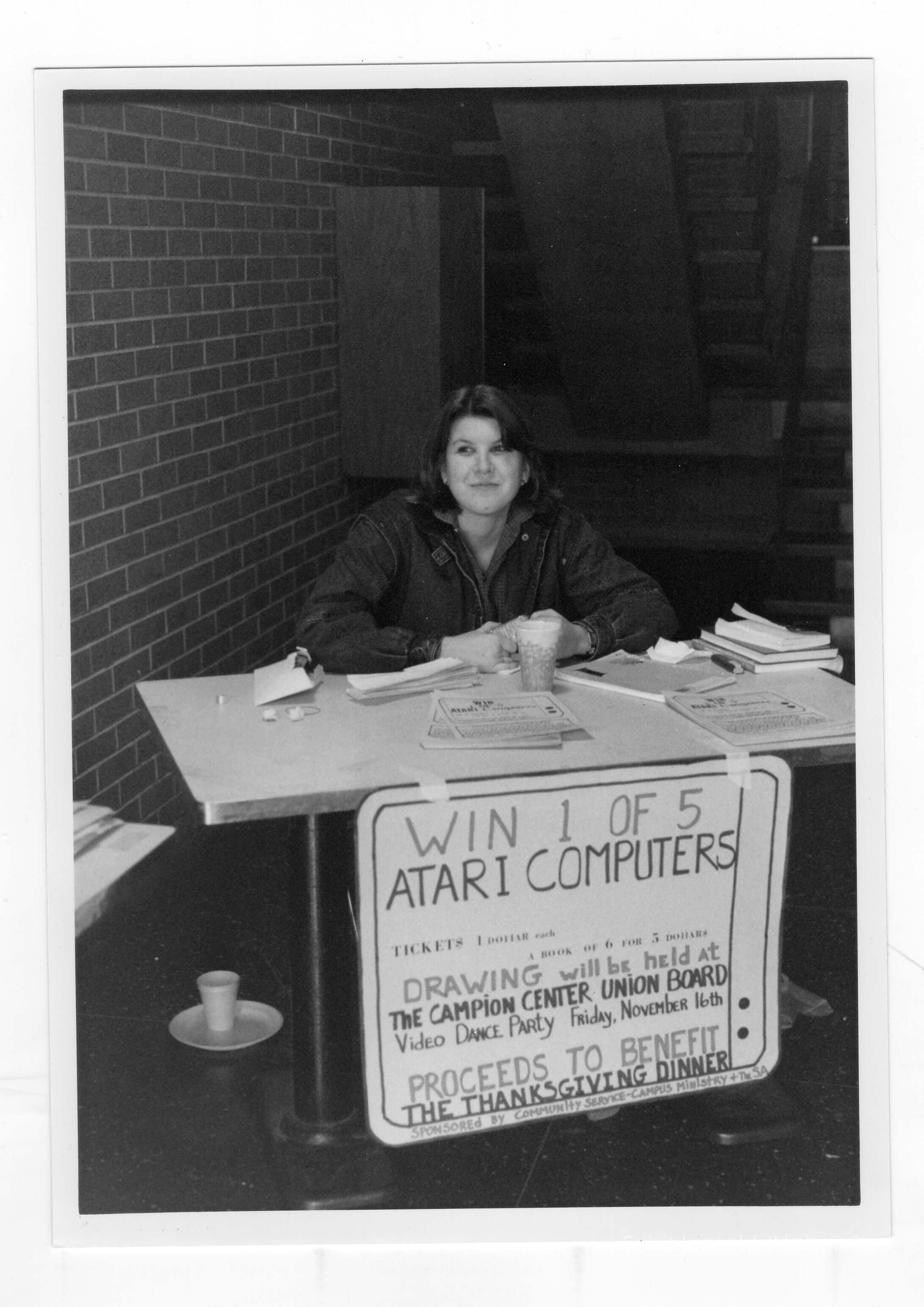 Student selling raffle tickets to win Atari computers to raise funds for Thanksgiving dinner for senior citizens, a community service/outreach project.