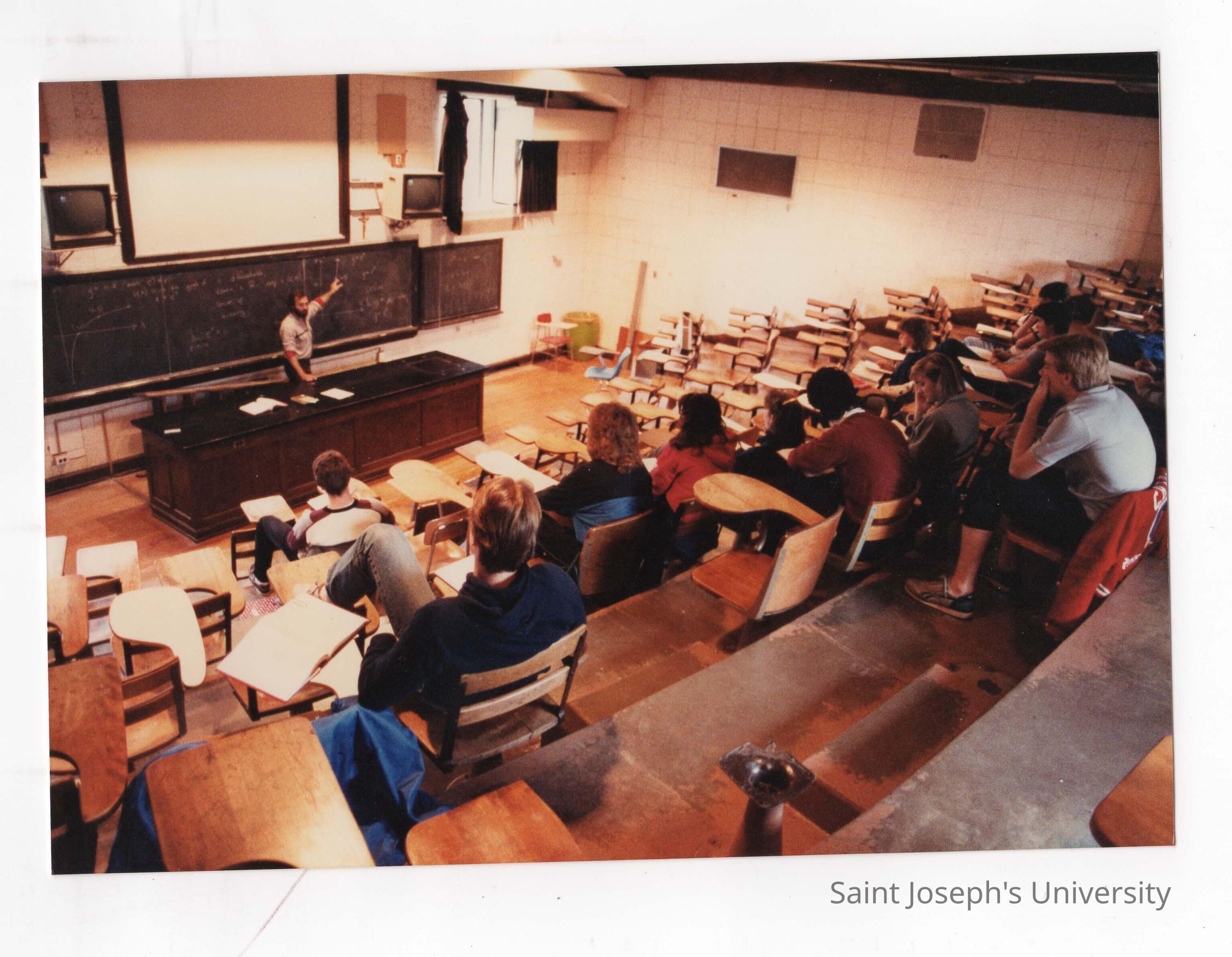 Students attending class in lecture hall with amphitheater style seating in Barbelin Hall.
