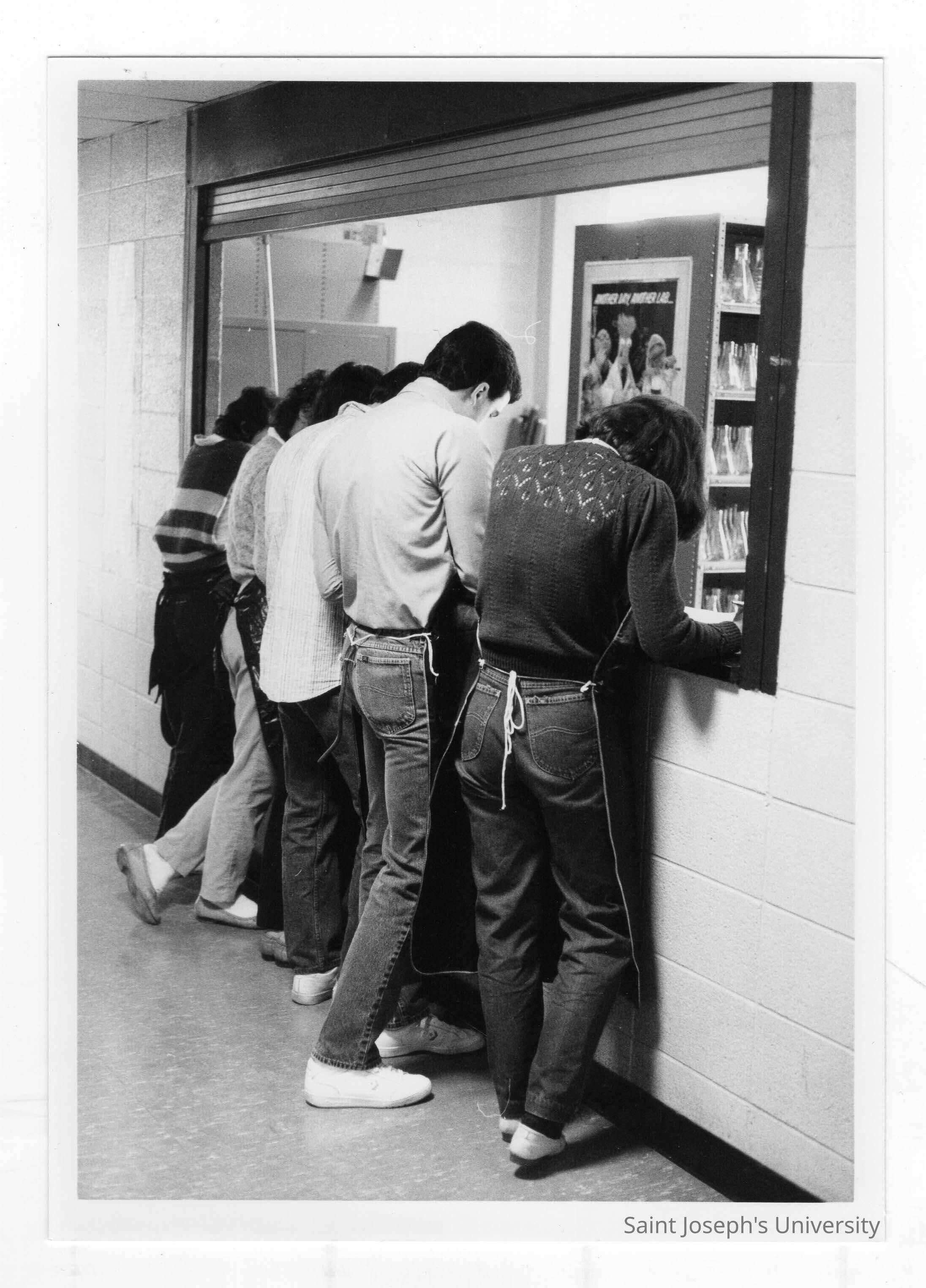 Students lined up at counter looking at paperwork during experiment in science laboratory.