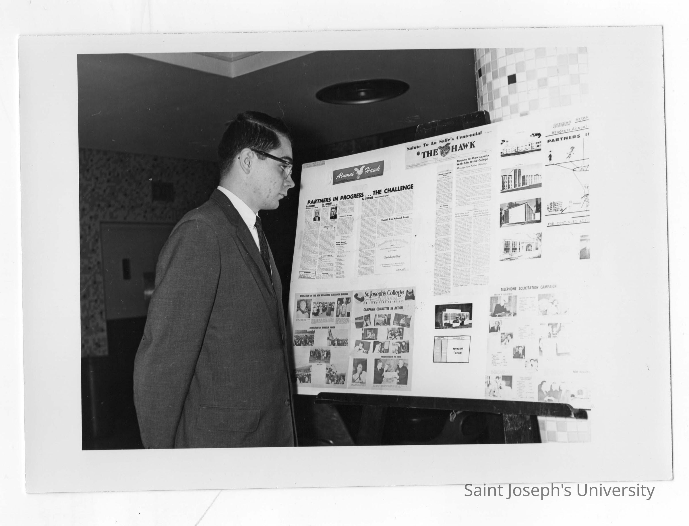 Photo of display of The Hawk student newspaper at centennial celebration of LaSalle University.