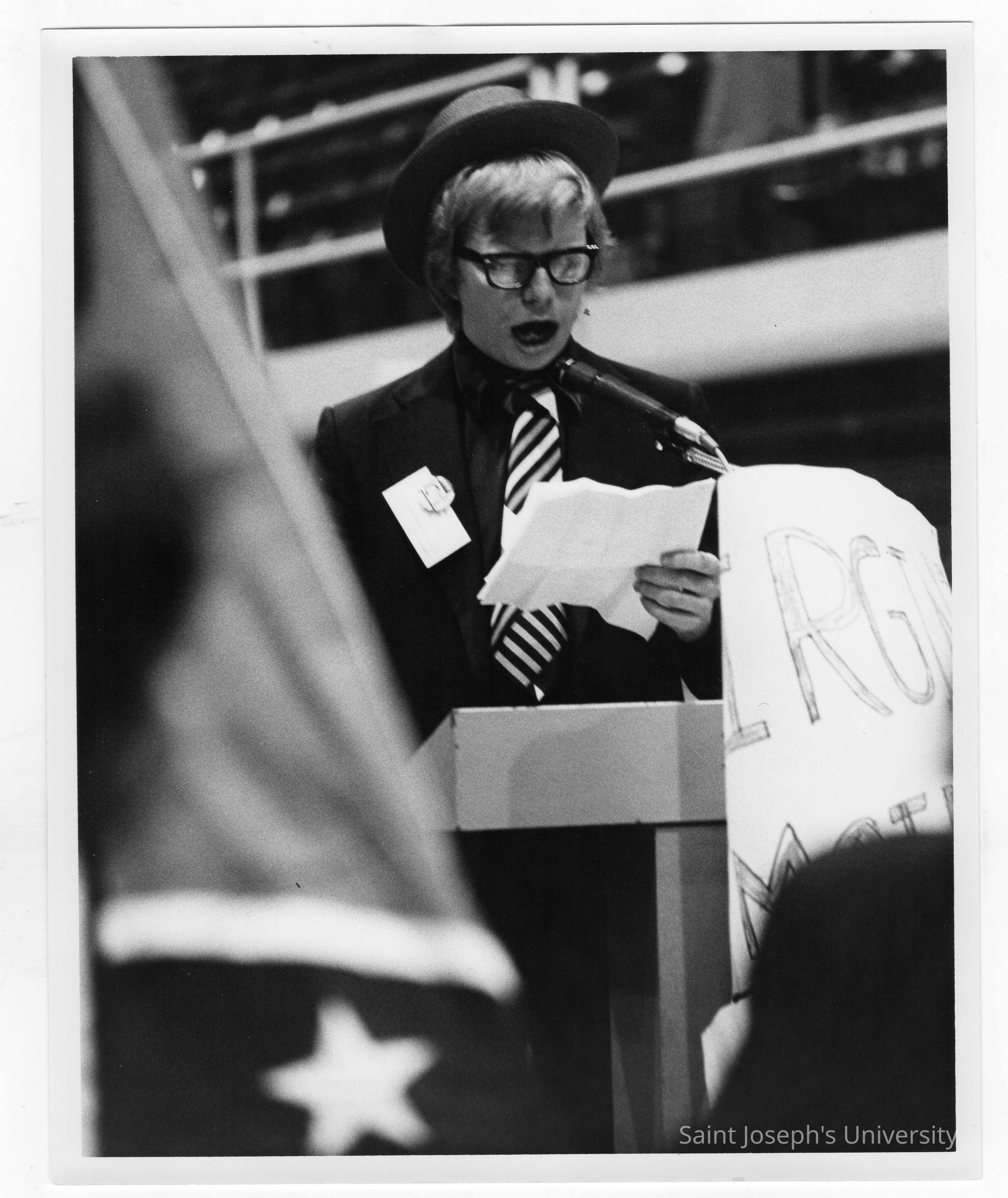 Student at mock Democratic convention in the Field House sponsored by the students of Delta Sigma Pi in March 1972.