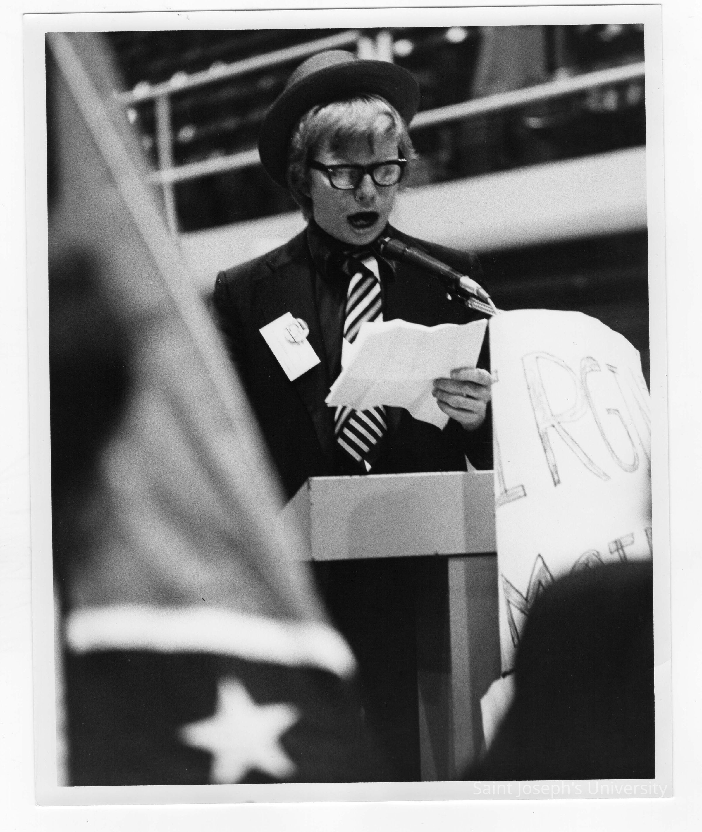 Student at mock Democratic convention in the Field House sponsored by the students of Delta Sigma Pi in March 1972.
