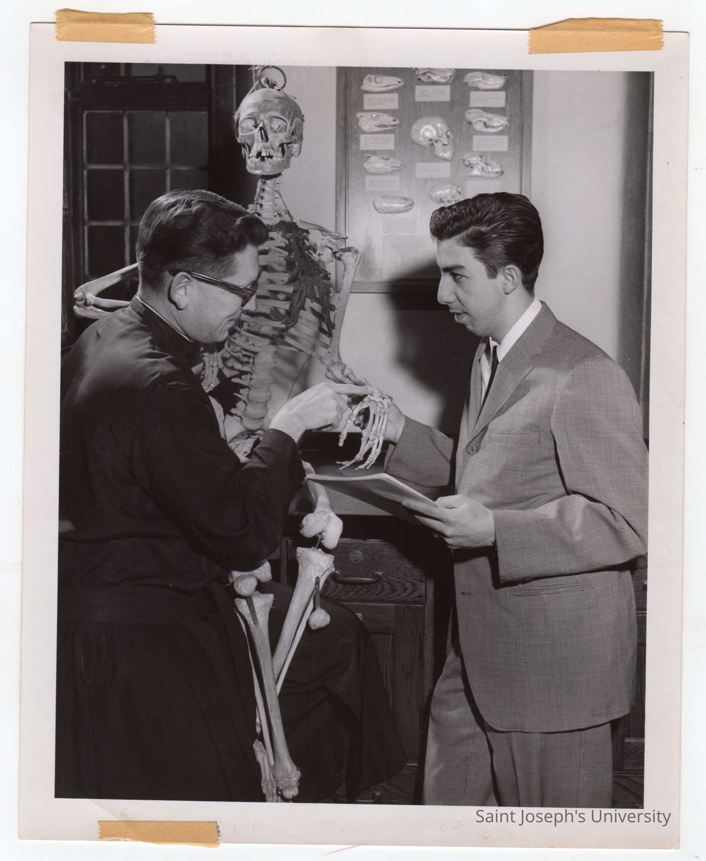 Biology professors Francis J. MacEntee, S.J. with student in science laboratory observing skeleton, February 1963.