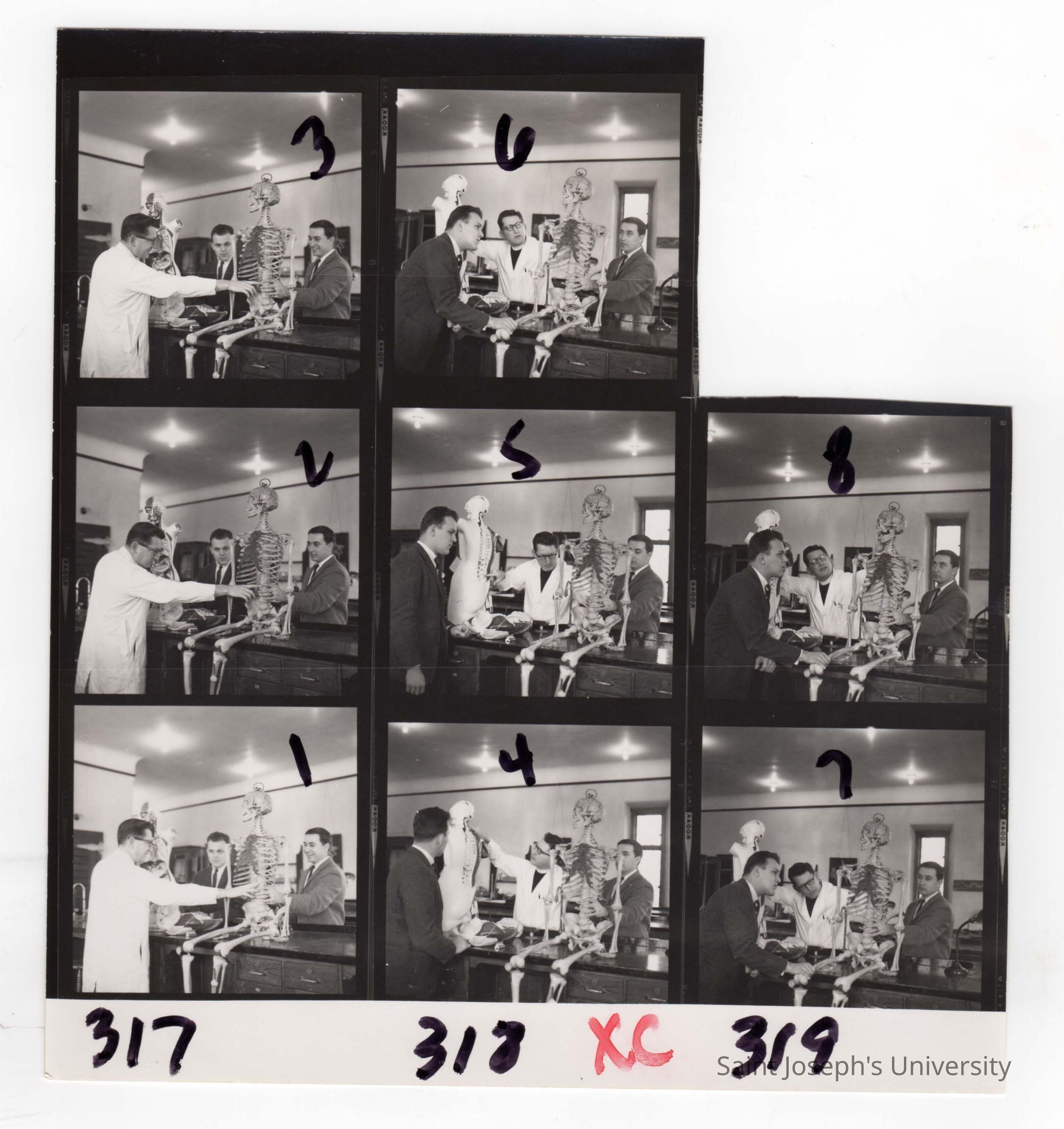 Views of faculty member, Francis J. MacEntee, S.J, of Biology Department looking at skeleton in science laboratory with two students, April 1964.