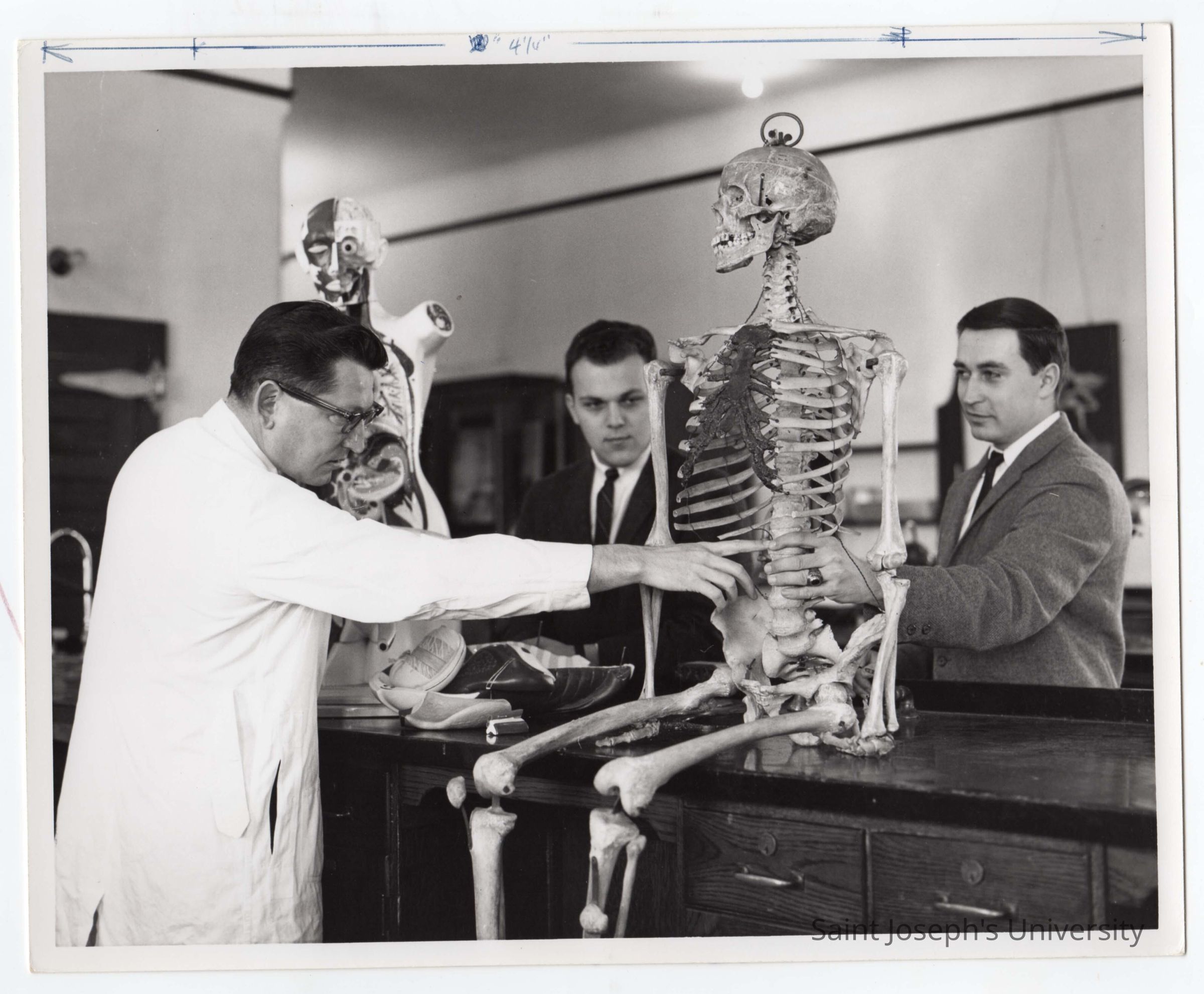Biology professor Francis J. MacEntee, S.J. with two students in science laboratory looking at skeleton, April 1964.
